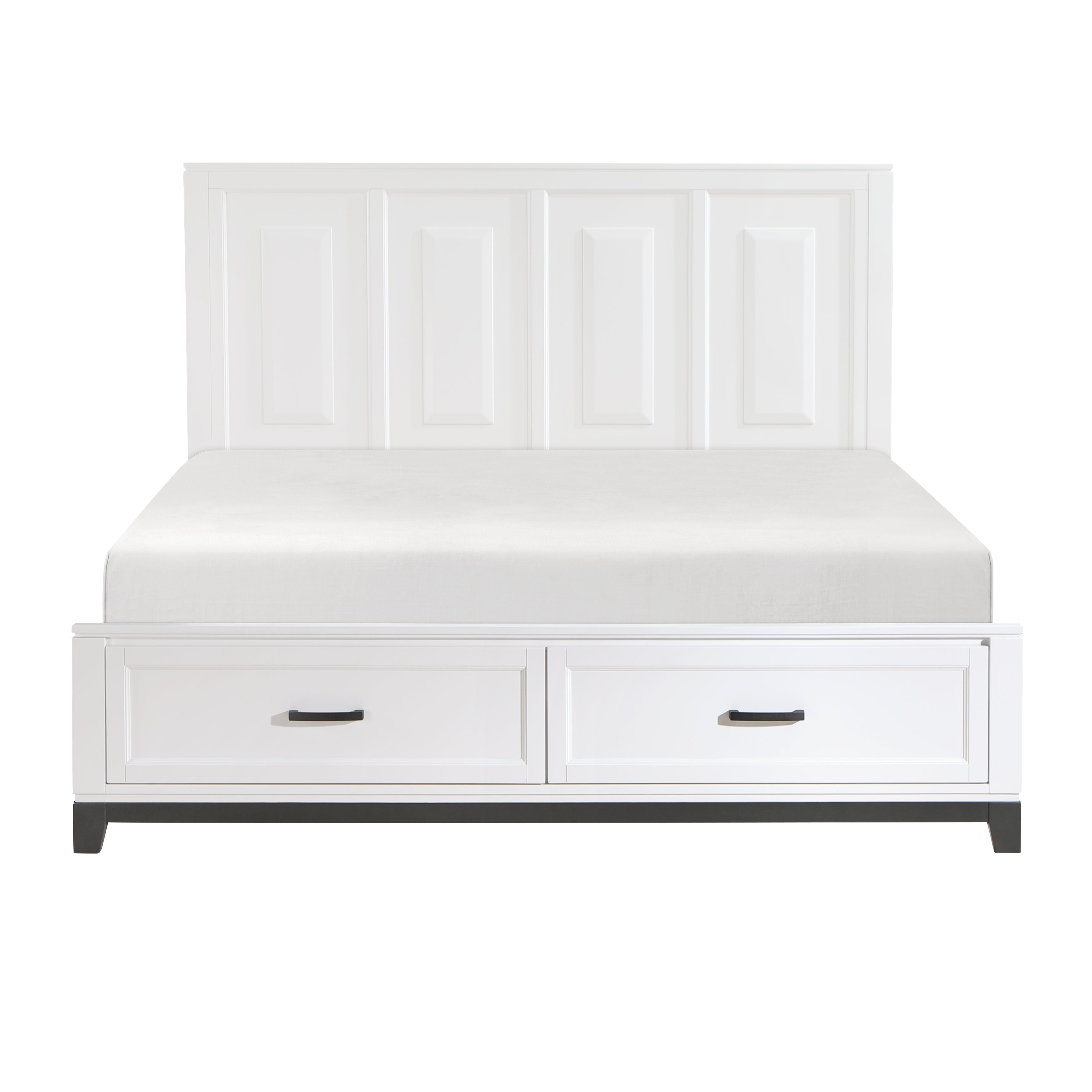 The Garretson Collection blends transitional lines with rustic styling to create an elegant addition for your bedroom. The distinct grain features a 2-tone finish. The Eastern King bed features metal bar hardware on the picture frame drawer fronts of the low-profile storage footboard, the two drawers creating additional space within your room for soft good storage.