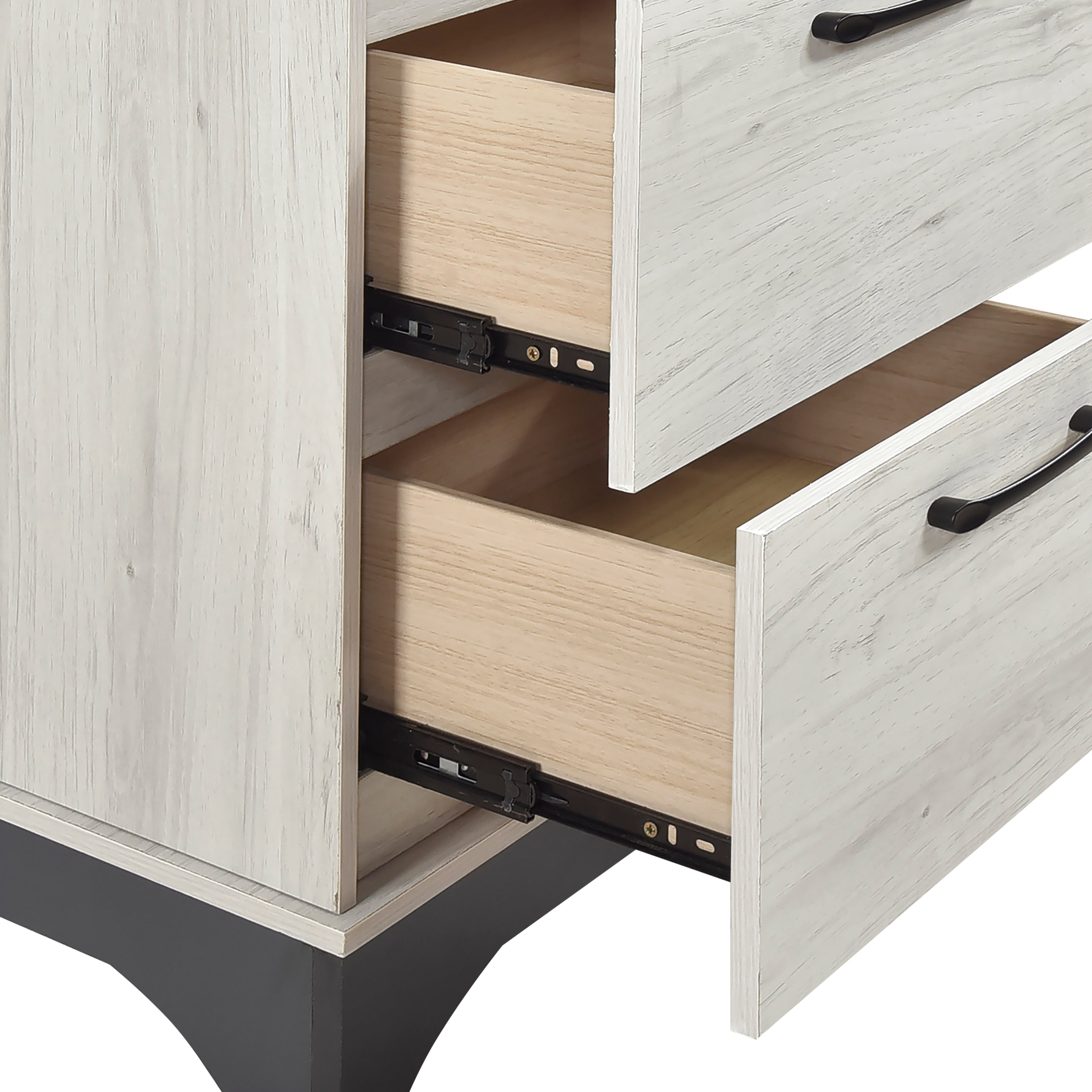 Enhance your bedside with this chic and functional 2-drawer nightstand, featuring a contemporary two-tone white oak and gray finish. Crafted from a durable blend of lamination paper, wood, and engineered wood, this piece offers a modern aesthetic with lasting stability. It boasts two spacious drawers that glide effortlessly on smooth ball-bearing glides, providing convenient storage for your nighttime essentials. Each drawer is accented with sleek black-tone bar pulls, adding a touch of modern sophistication to its design. Best of all, this nightstand arrives fully assembled, allowing you to instantly elevate your bedroom with its clean lines and practical features without any setup hassle.
