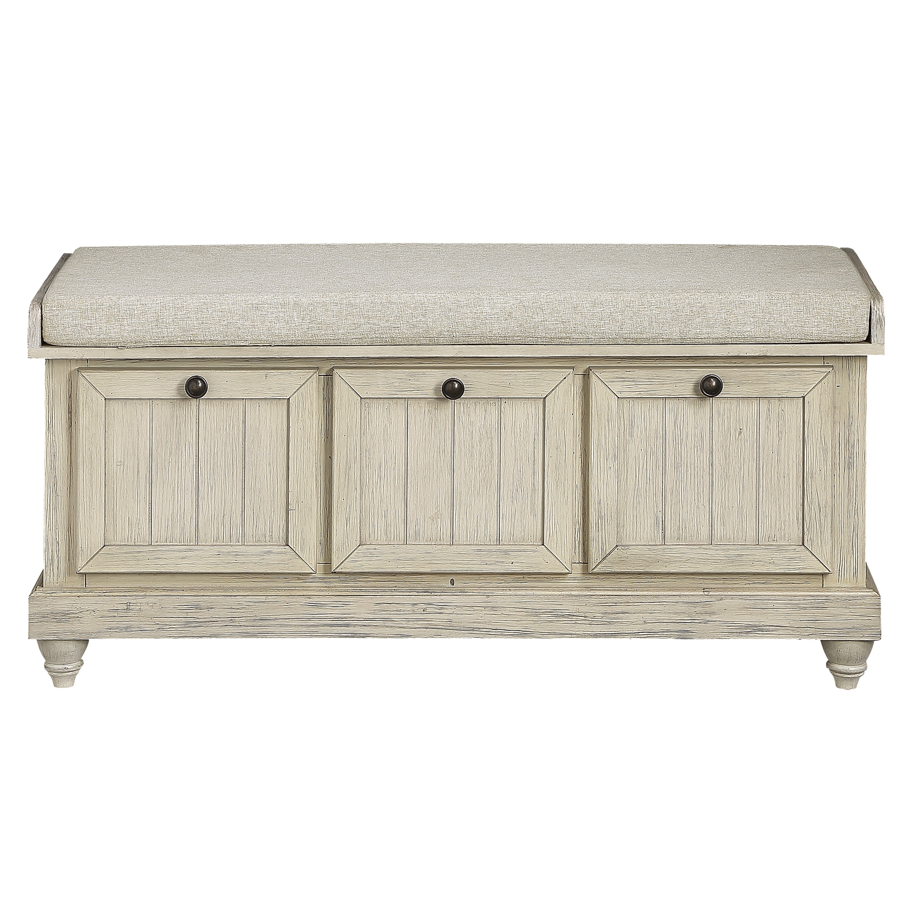 The Woodwell Collection will be a functional addition to your home. False drawer fronts serve as the base for this lift-top storage ottoman. A neutral tone beige padded seat provides a comfortable spot to sit as you prepare for your daily outings. Knob hardware creates a contrast to the antique white, with grey rub-through, finish.