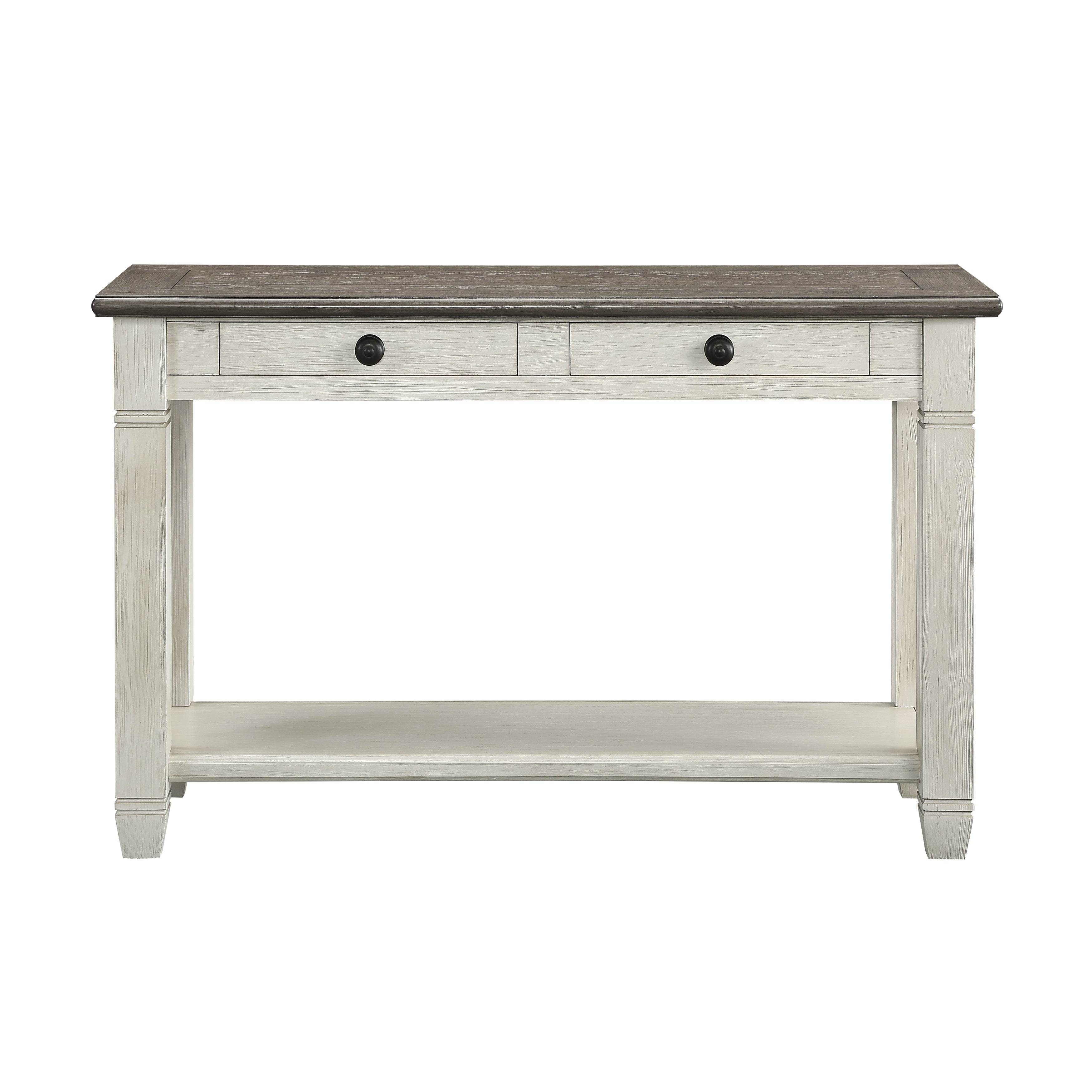 Inspired by the aesthetic of a casual country home and providing functional decorative accent for your living room is the occasional table set of the Granby Collection. The two-tone look of the acacia and pine solids base, finished in antique white, and the oak veneer of the sofa table’s rosy brown-finished tops, present as a harmonious combination of color, perfect for your home. Dark finished metal knob hardware fronts the functional drawers while providing subtle contrast to the finish of the collection. An open display shelf creates a perfect spot for display of your decorative accessories.
