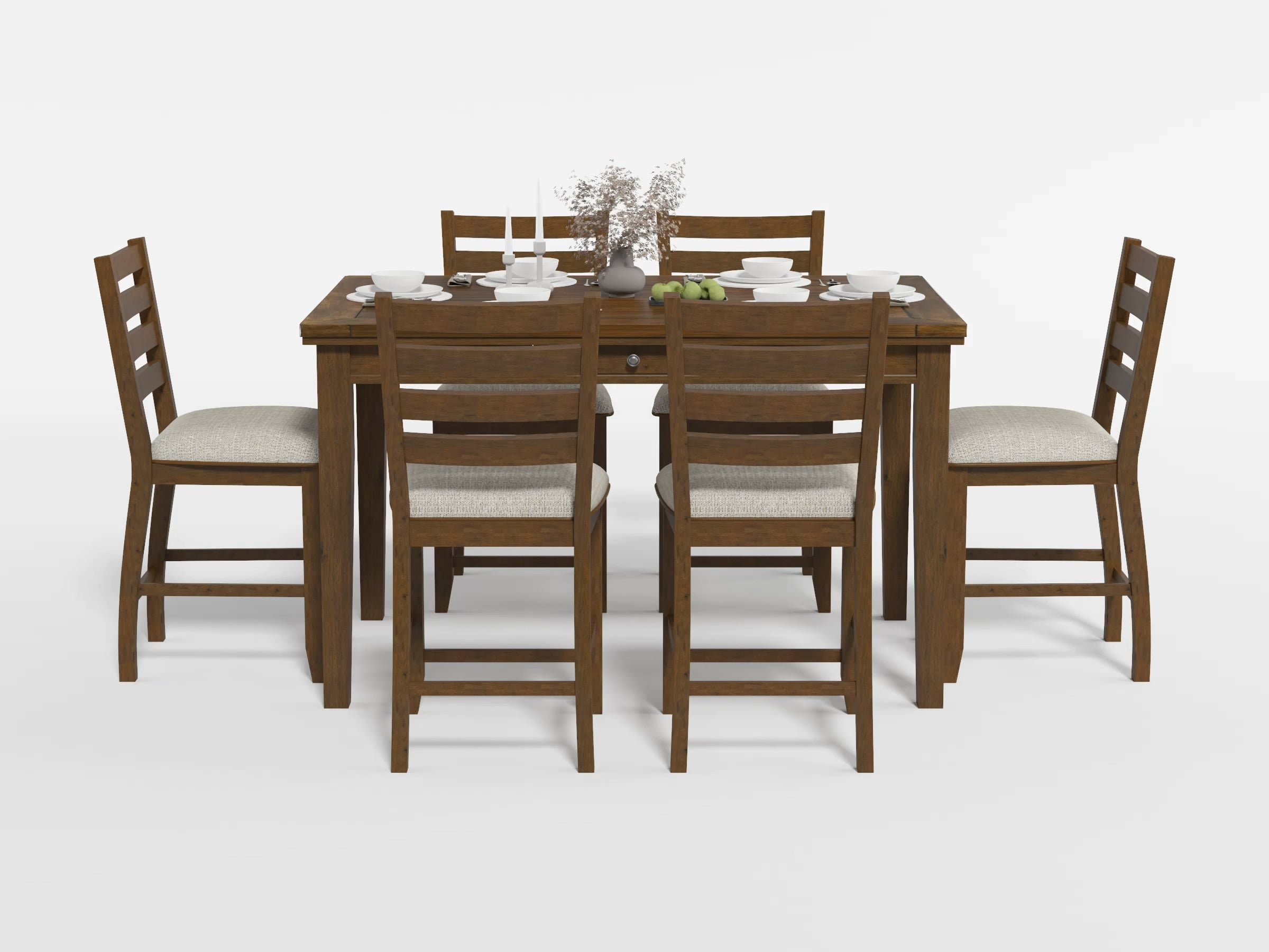The traditional styling of the Tigard Collection lends timeless appeal to the look of your casual dining space. With subtle hints nodding to the Arts and Crafts design movement, the ladder-back counter height chair features classic lines that solidify the versatile aesthetic of the collection. Covering the padded seats of the chair is a neutral tone fabric upholstery, complementing the traditional gray finish of the chair’s wood veneer.