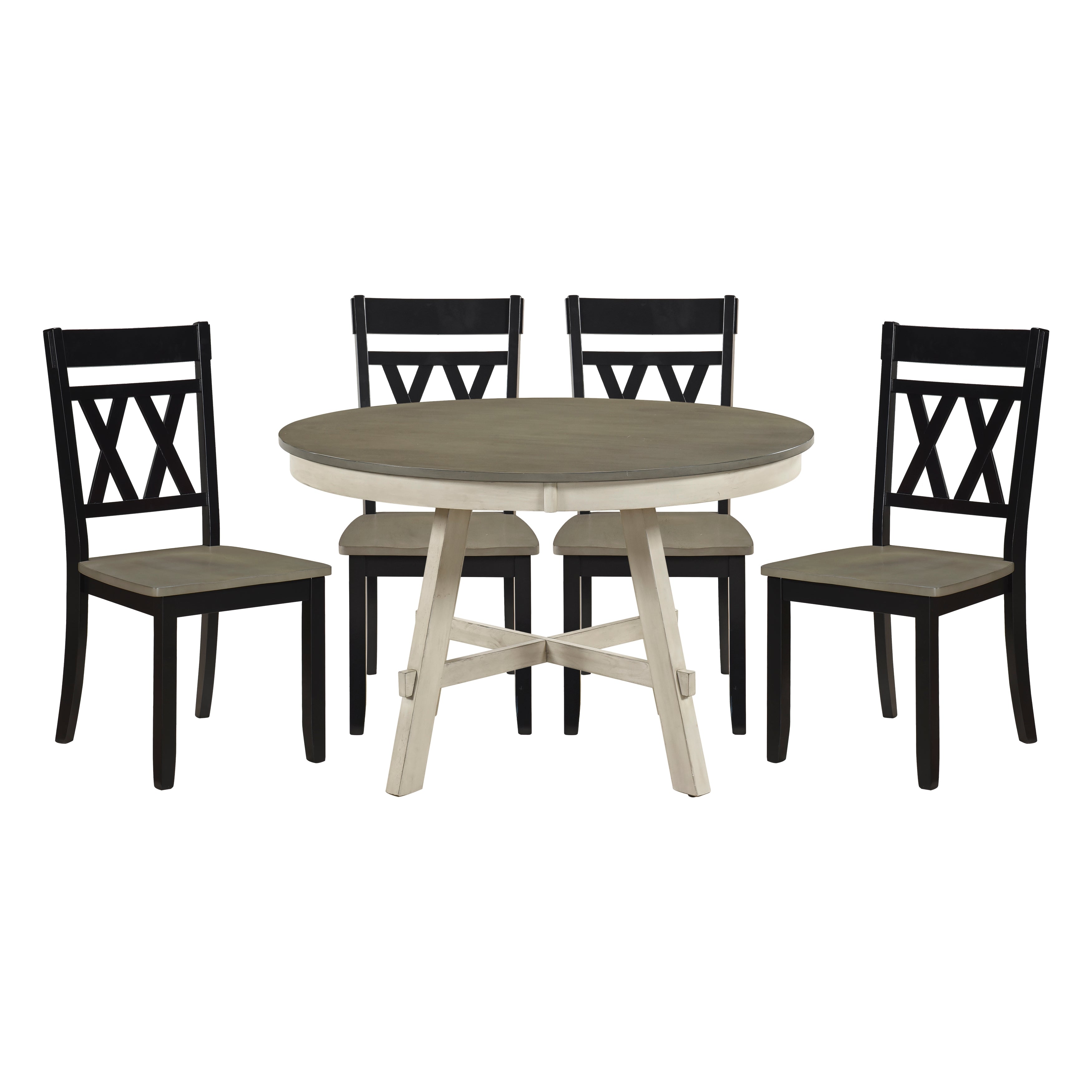 Elevate your dining space with this stylish two-tone round dining set, blending rustic charm with modern farmhouse elegance. Featuring a durable Mindy veneer tabletop in a chic greywash finish and solid wood legs in classic antique white, this compact round table comfortably seats four—perfect for cozy dining rooms, breakfast nooks, and small kitchen spaces. Pair it with our matching X-back dining chairs, all finished in black with a greywash seat for a coordinated look. Each chair offers lasting comfort and sturdy support. This farmhouse-modern dining collection delivers timeless style, everyday durability, and a warm, welcoming atmosphere to your home.