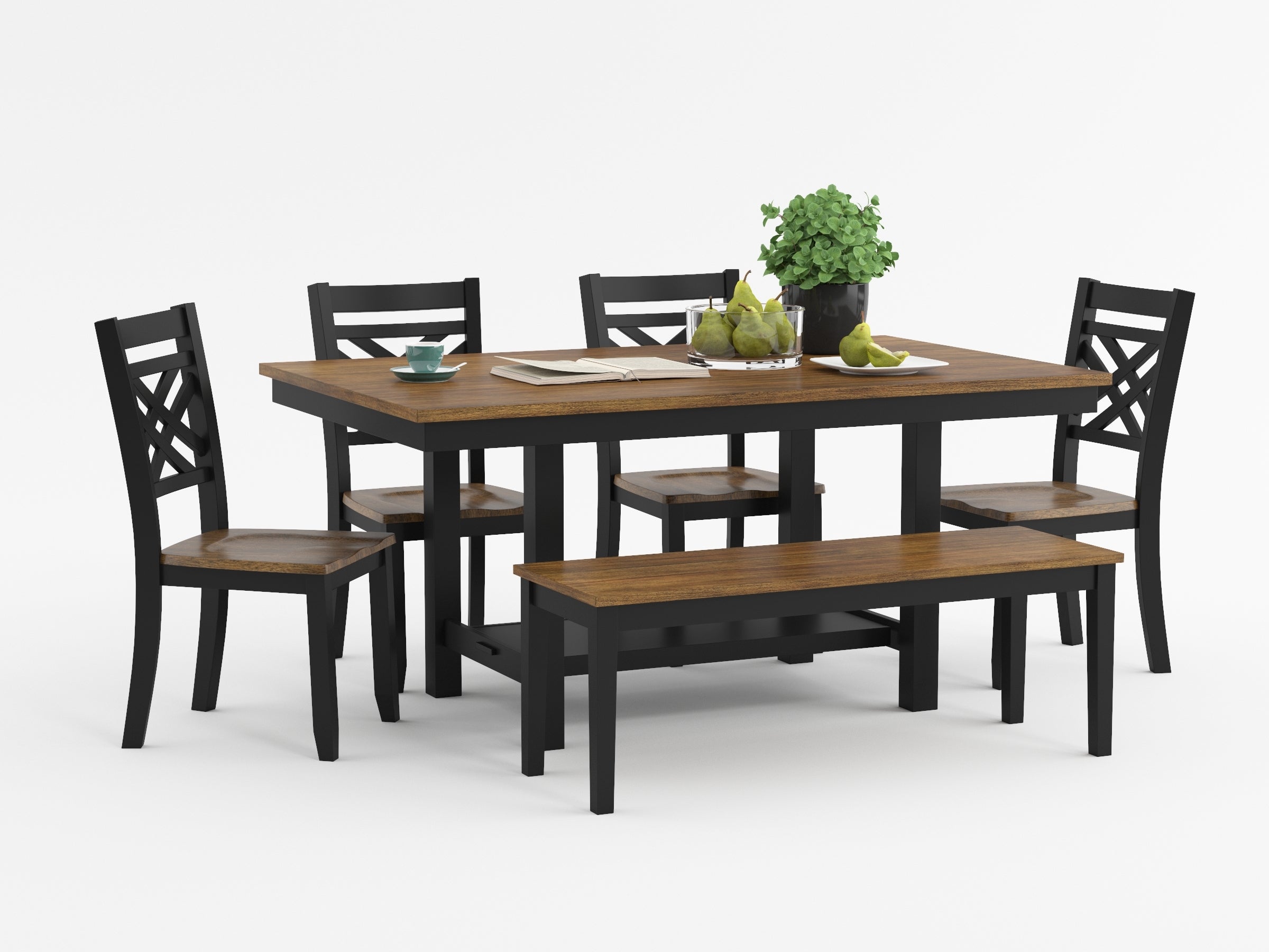Transform your dining space into a welcoming hub for family meals with this sturdy rectangular dining table. Expertly crafted from a robust blend of acacia veneer, wood, and engineered wood, this piece features a stunning two-tone finish that pairs a warm, natural brown tabletop with a bold black structural base. This modern farmhouse-inspired design is not only stylish but highly functional, offering comfortable seating for up to six guests. The unique trestle-style base includes a built-in lower shelf, providing a convenient spot for decorative accents or extra storage, making it a practical choice for both casual breakfasts and formal dinner parties.