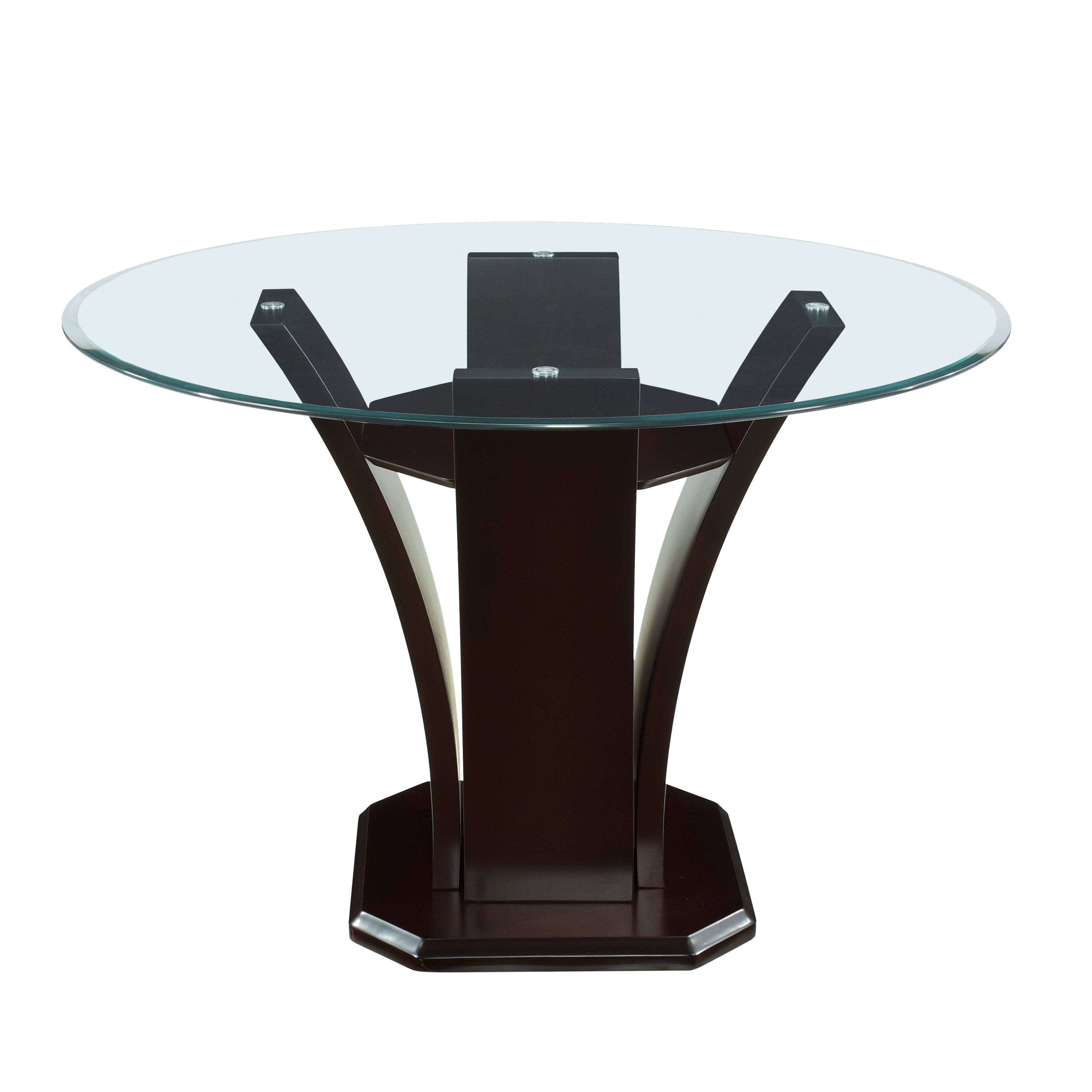 Daisy Collection combines superb visual appearance and fine quality that you need in your dining area. Three distinct elegant flared tulip bases support beveled glass tabletops on the round counter height table. Counter height chairs feature clean lines and sleek curves; available in both white faux leather and dark brown faux leather. The set is constructed of hardwood solids and veneers in a refreshing espresso finish.