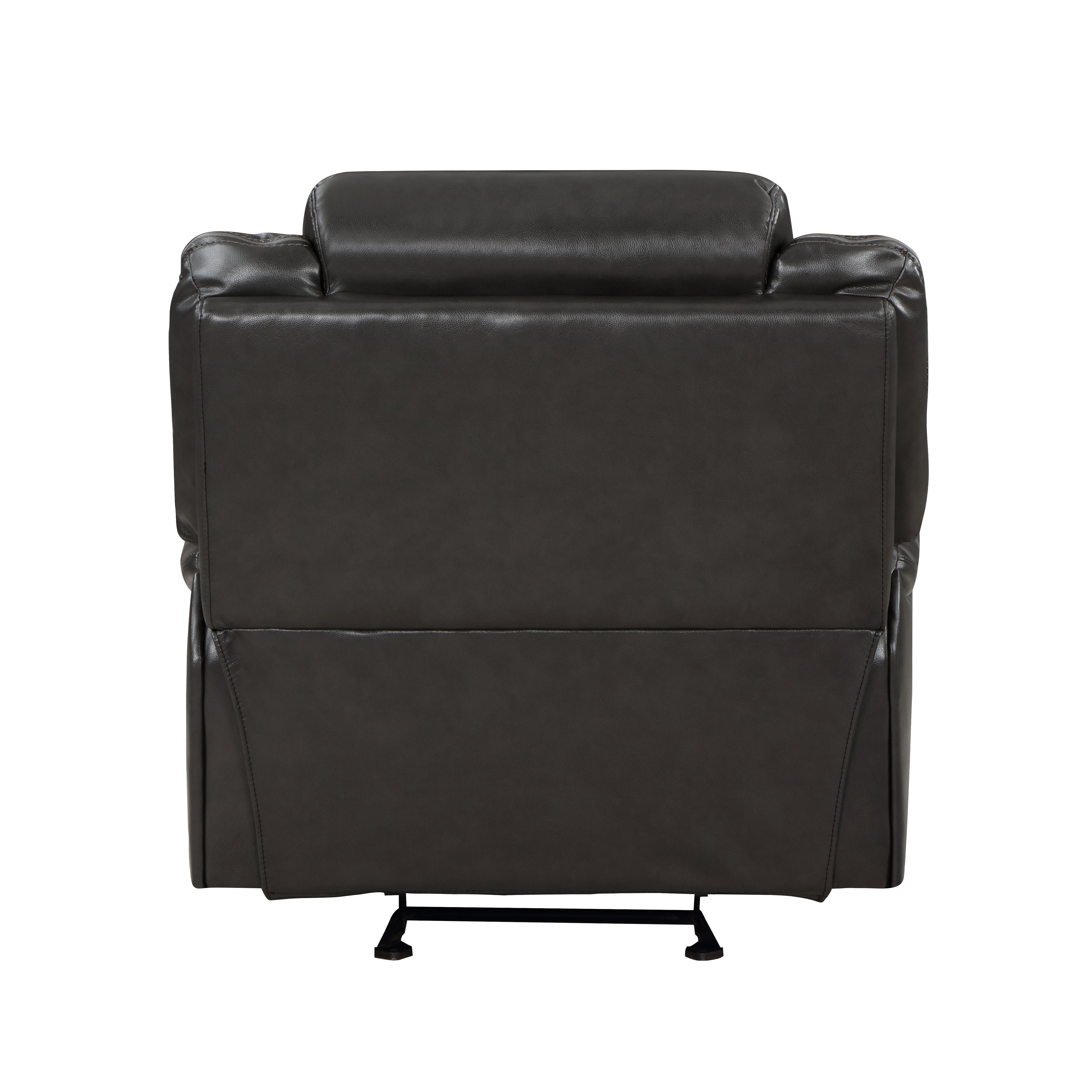 Ultra-modern design combined with convenient function makes the Amite Collection a stylish addition to your contemporary home. dark gray premium faux leather upholstery is perfectly complemented by light gray accenting on the seatback, seat, and arms of the chair providing contrast and definition to the profile of the collection. With the pull of the manual reclining mechanism tab, the recliner eases to the prone position.