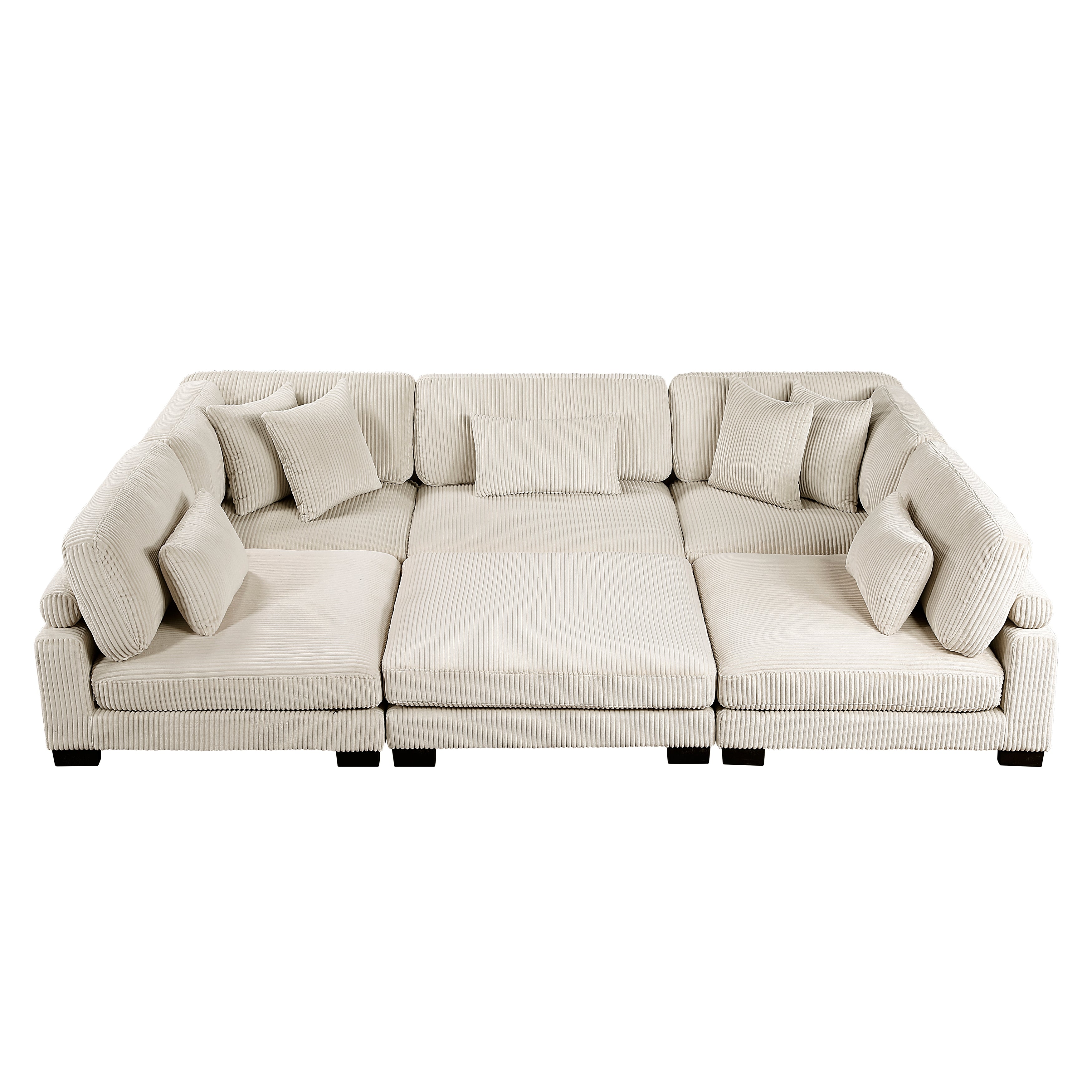 Configurable to your available space, the Traverse Collection allows for the addition and detachment of pieces for a customized seating experience. The 6-piece sectional configuration consists of two corner units paired with three armless chairs, and an ottoman. The plush beige corduroy fabric upholstery creates a plush expanse for a soft touch experience. The corner seat features two toss pillows, adjustable back and arm rest, and reversible cushions. The armless chair features a lumbar pillow, and reversible cushions.