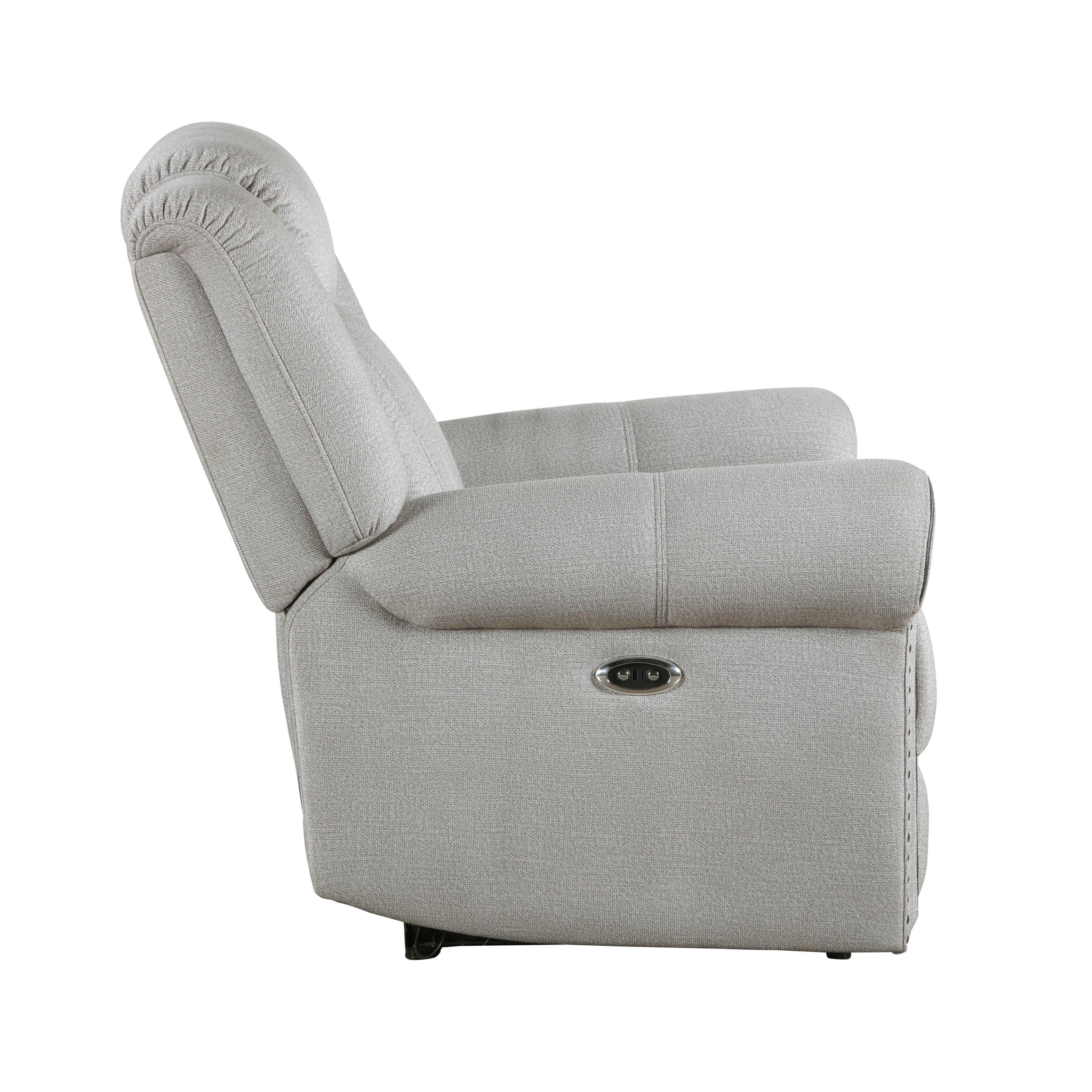 Styled for the transitional home, the Brennen Collection’s comfortable presence will be a perfect match for your casual living room. The chair features a power reclining mechanism allowing for ease of motion when going from seated to reclined. Plush seating is defined by the contoured stitching, while the arms of the chair are accented with nail head trim. Mist-hued textured microfiber covers the seating group, providing soft touch and decorative versatility.