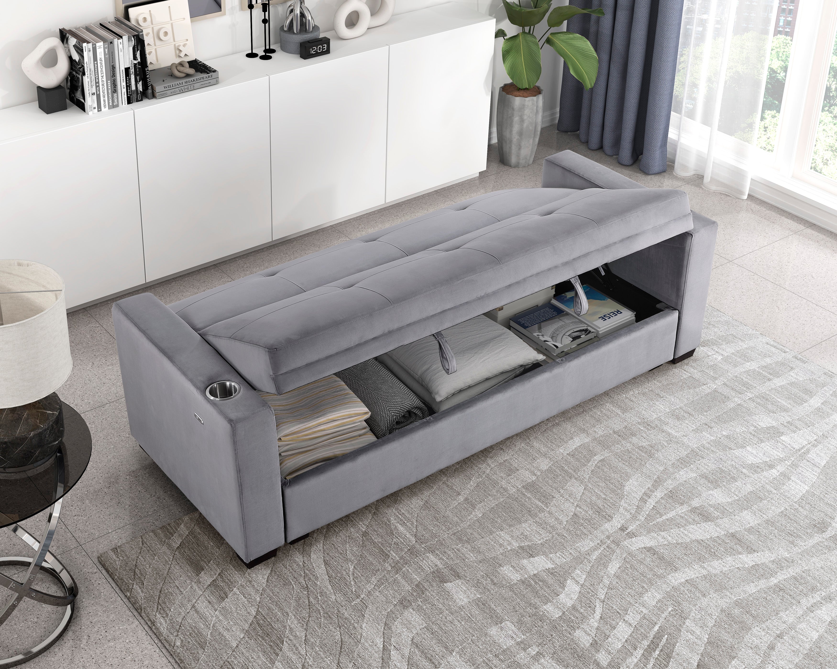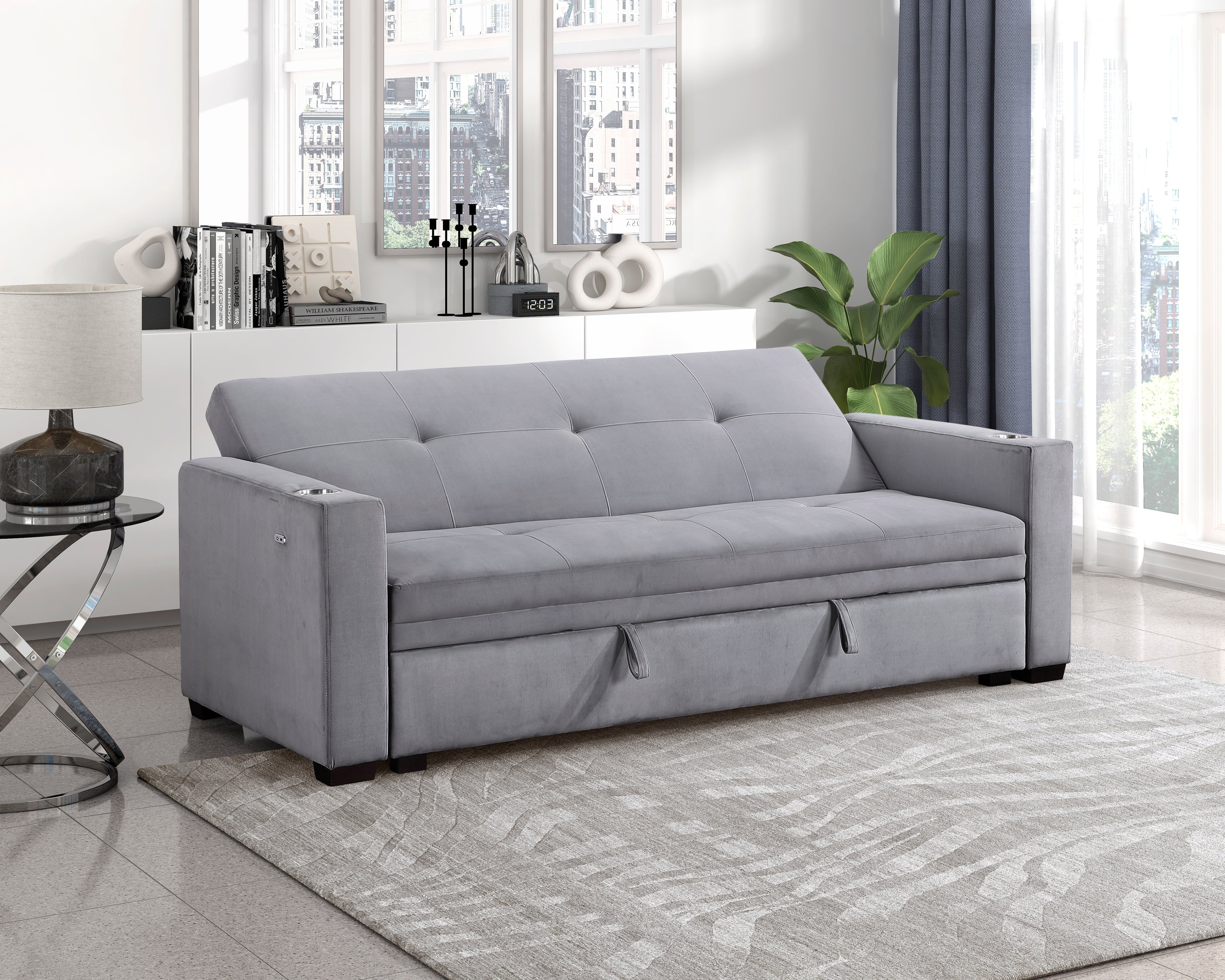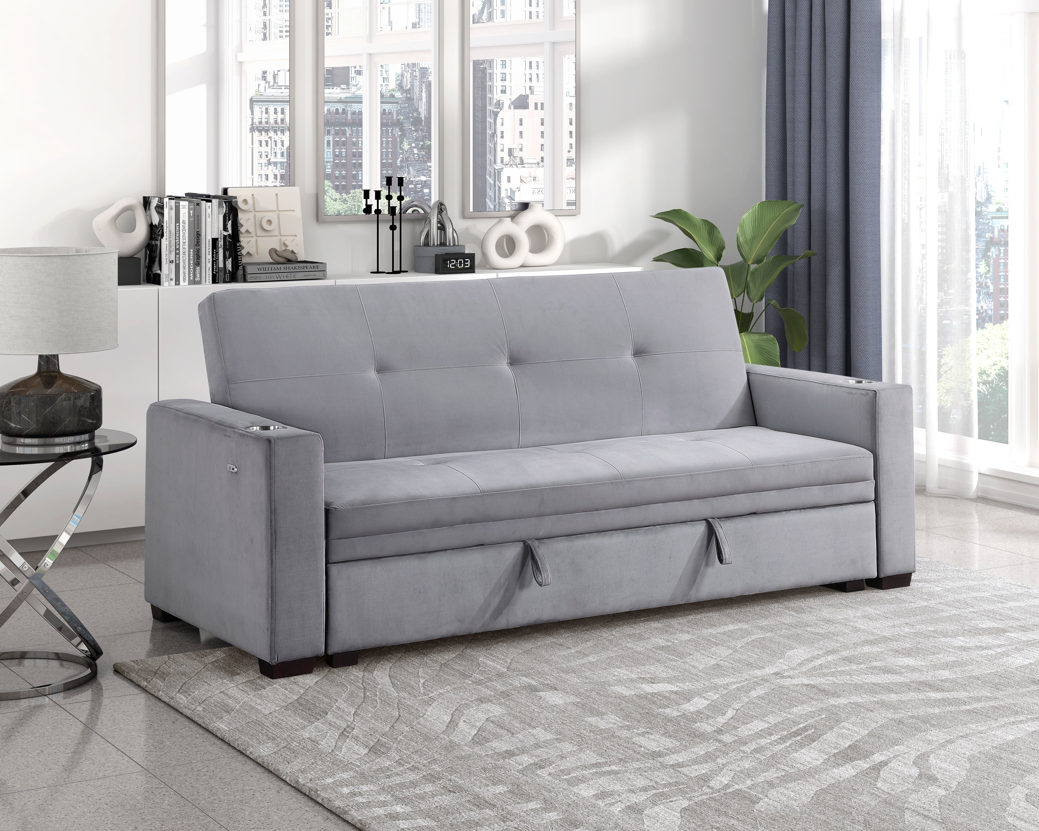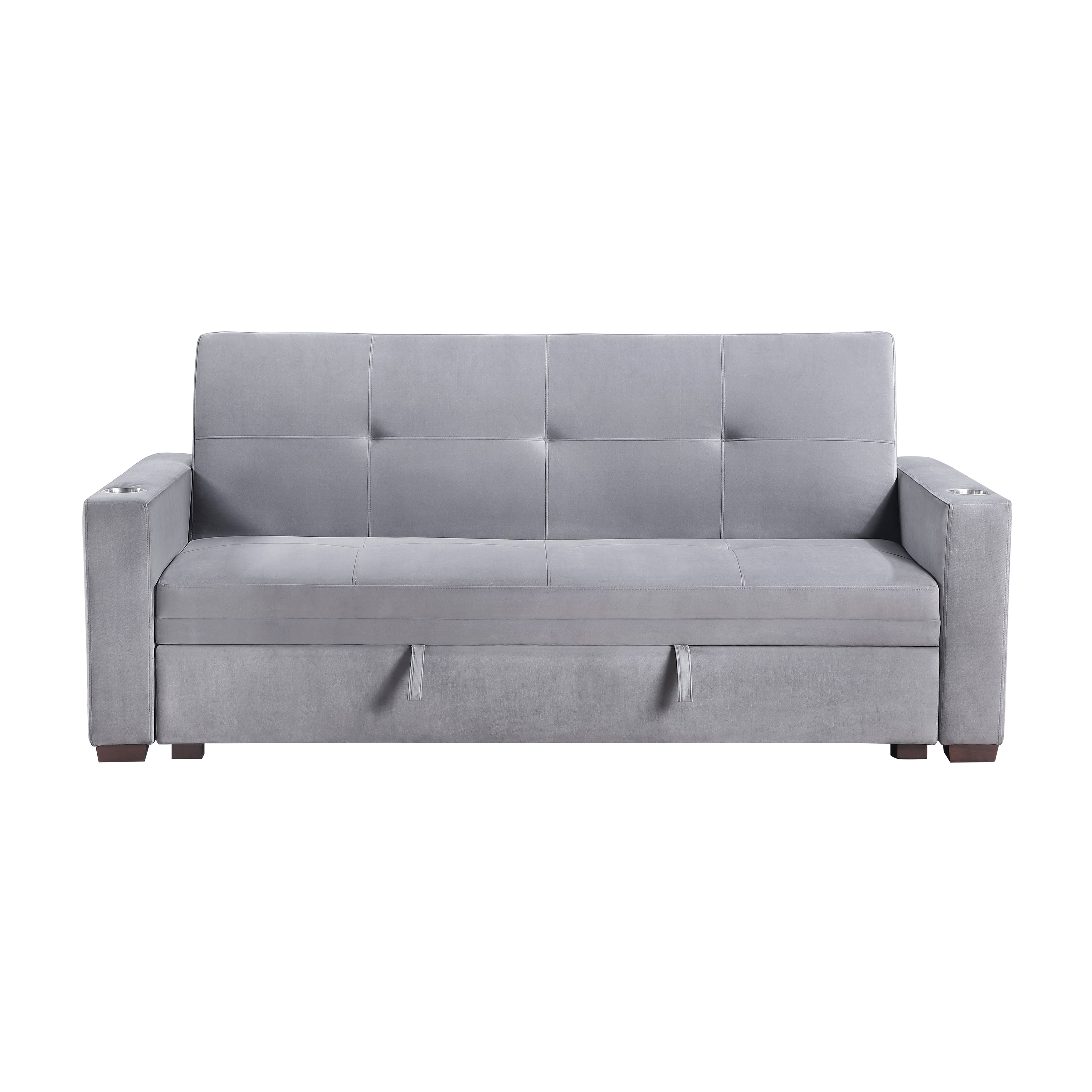 The Grady Collection allows for ease of expansion of your seating area to sleeping platform, with the engagement of the click-motion seatback and pop-up bed. Gray velvet covers the seating group, providing a soft touch to the modern frame of the sofa. Cupholders are mounted on the sofa’s arms for ease of access to your beverages.