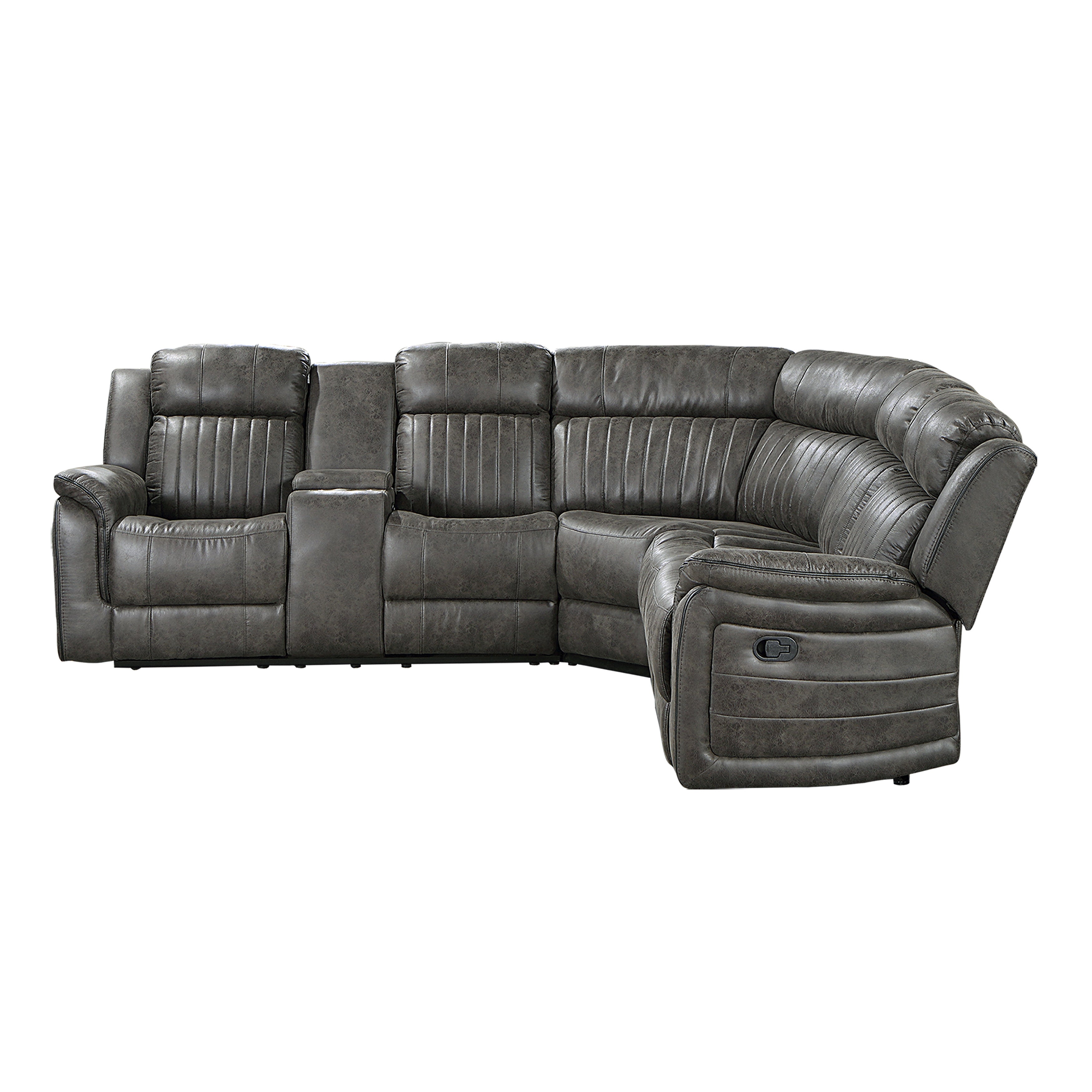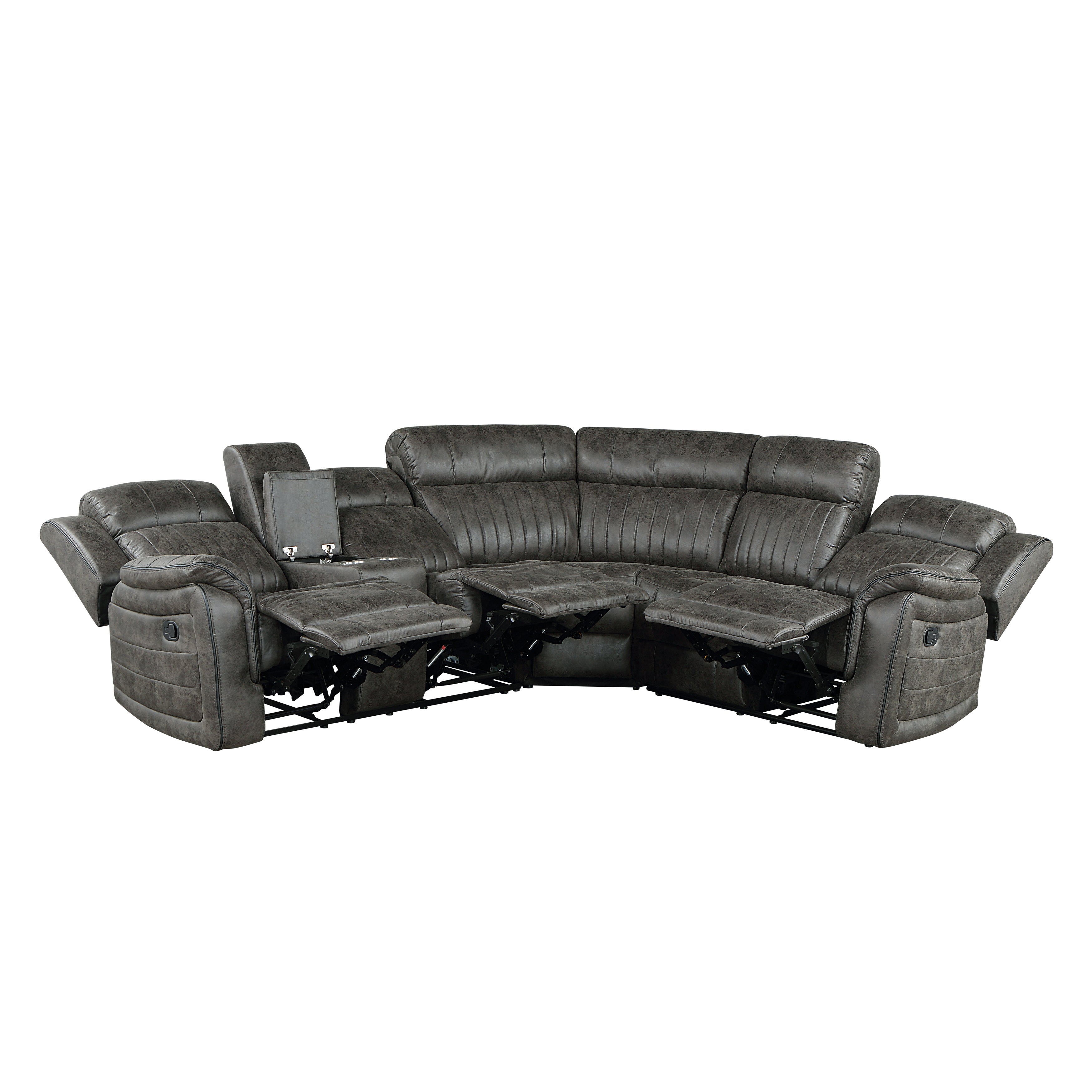 The design of the Centeroak Collection provides a platform for your relaxing downtime. From the classic transitional style to the versatile neutral color of the brown-ish gray faux suede fabric covering, this collection is the perfect addition to your living room. Plush seating features vertical tufting, pillow-top arms, each enhanced by the dual end recliners of the sectional. Creating additional function is the console unit providing secure placement of beverages and lift top hidden storage. The reclining mechanisms of the end recliners are engaged by a pull of the side mounted tabs, taking you from seated to prone in an easy motion.
