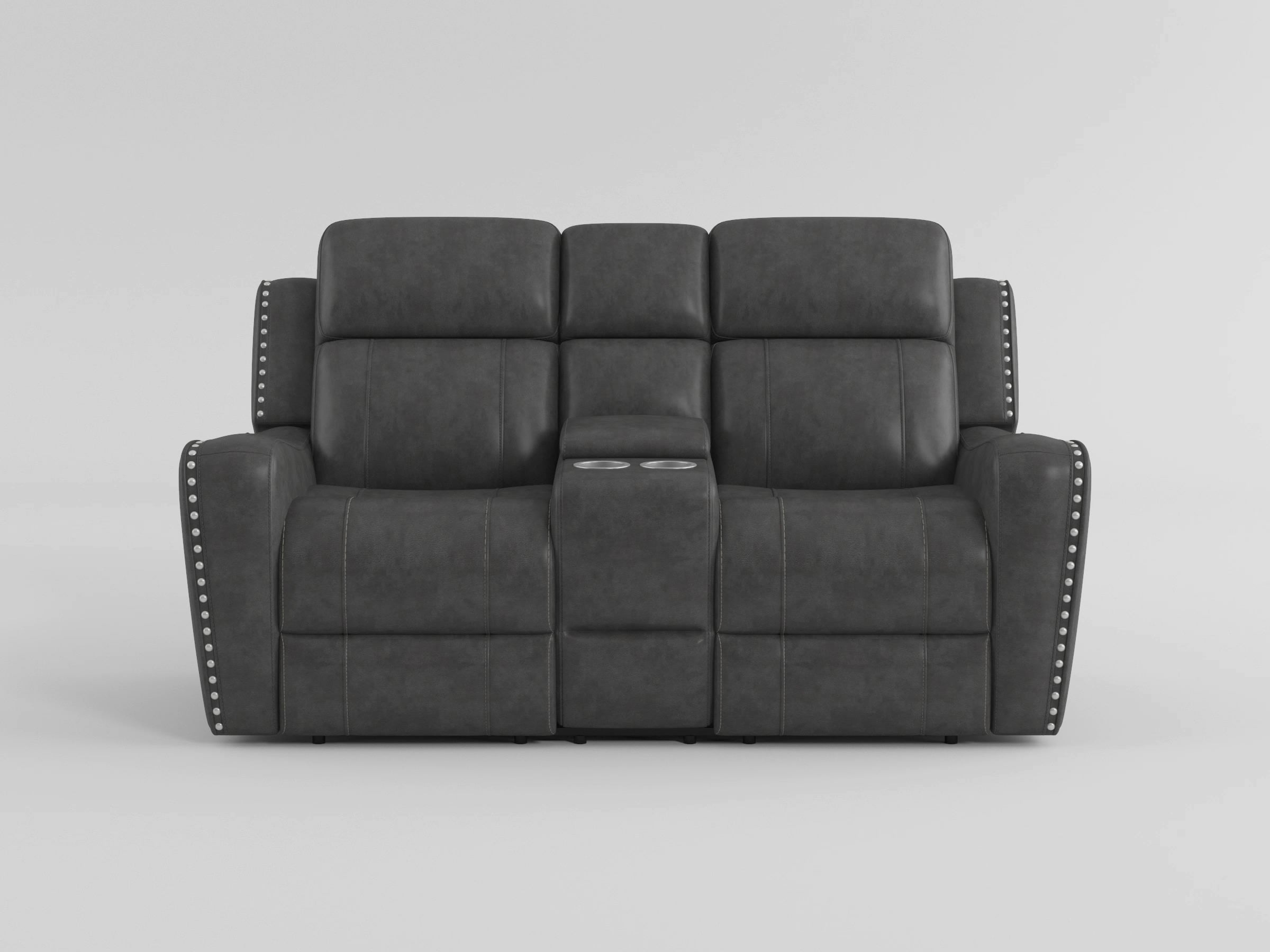 Enhance your shared relaxation space with the double reclining loveseat, featuring a convenient center storage console and dual cup holders. Upholstered in a sophisticated, breathable polished microfiber accented with elegant nailhead trim, this loveseat offers both luxurious comfort and practical functionality. Each seat reclines independently with a smooth pull-handle motion, allowing you and your companion to find your perfect lounging positions. The dacron-wrapped high-density foam seat cushions provide exceptional support for extended comfort, while the robust solid wood and plywood frame with metal-reinforced seating ensures lasting durability, supporting up to 300lbs per seat. With its attached back and seat cushions maintaining a clean aesthetic and the added benefit of a central storage console for remotes and beverages, the loveseat is the ultimate addition to any living room or home theater seeking style and convenience.