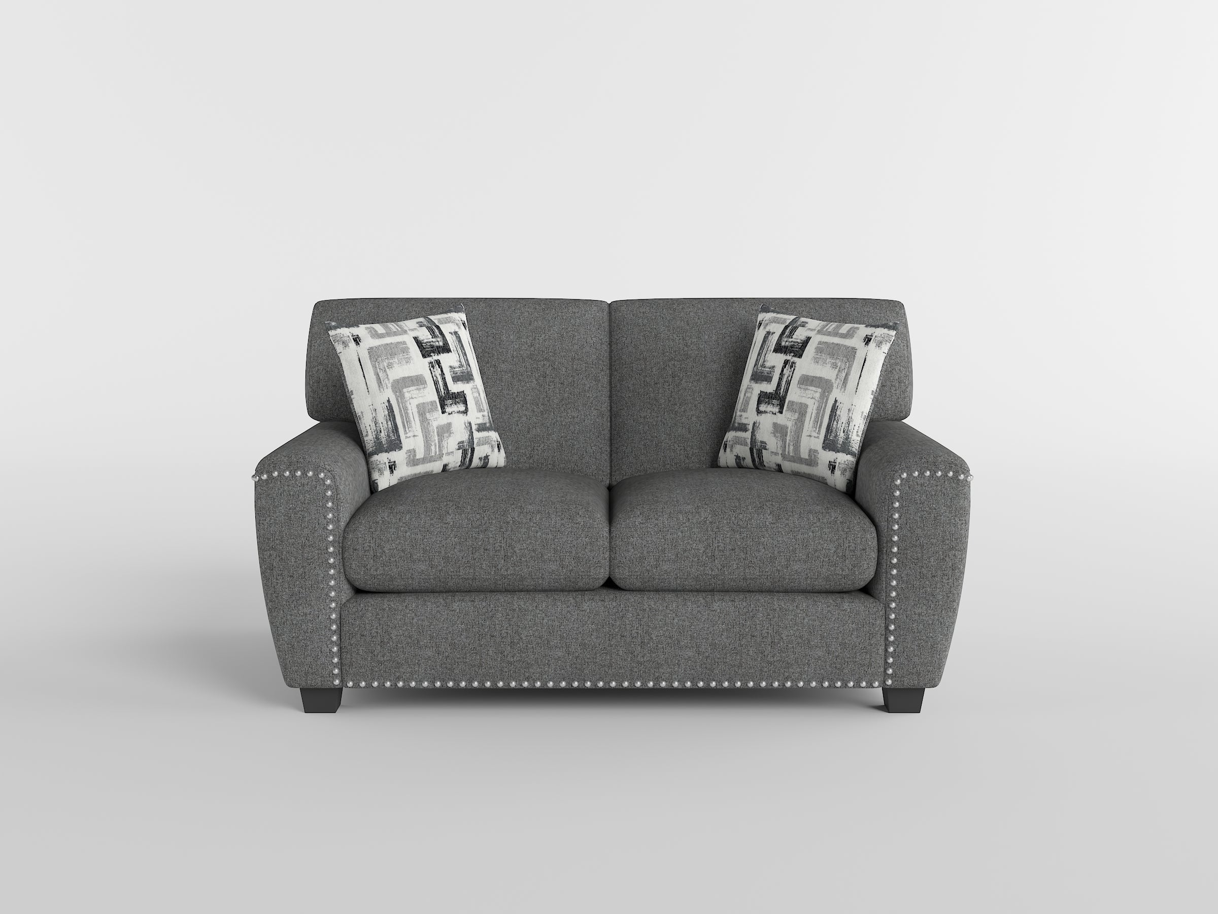 Enhance your living space with this versatile and stylish gray Loveseat. Featuring reversible back and seat cushions, this loveseat offers extended comfort and longevity, allowing you to easily refresh its appearance. Two decorative pillows add a touch of pattern and comfort. The textured dark gray fabric upholstery complements a variety of décor styles, while the nailhead trim detailing adds a touch of sophistication. The sturdy block feet provide a stable foundation, making this loveseat a perfect addition to apartments, small living rooms, or cozy nooks. Enjoy the perfect blend of comfort, style, and practicality with this contemporary 2-seater sofa.