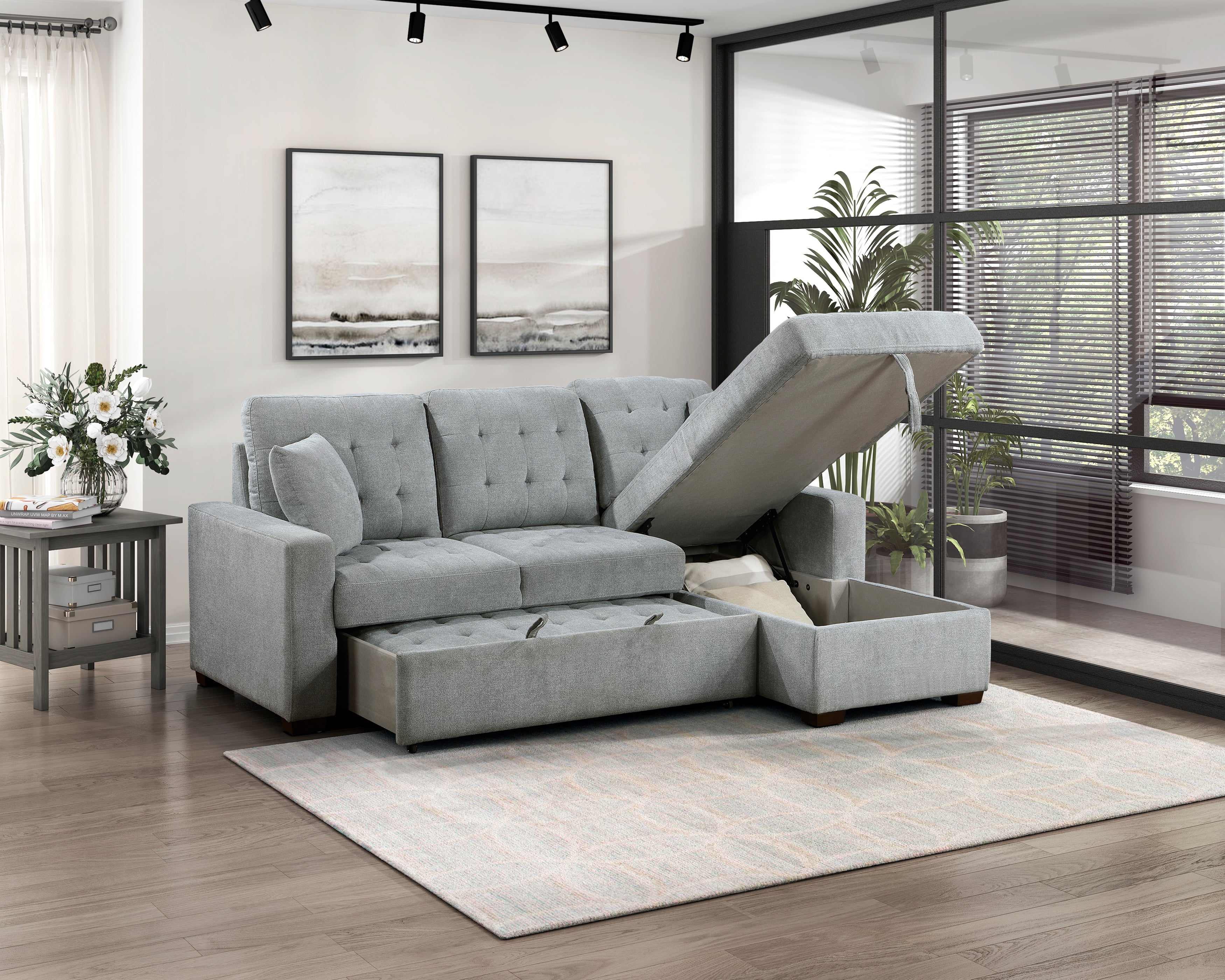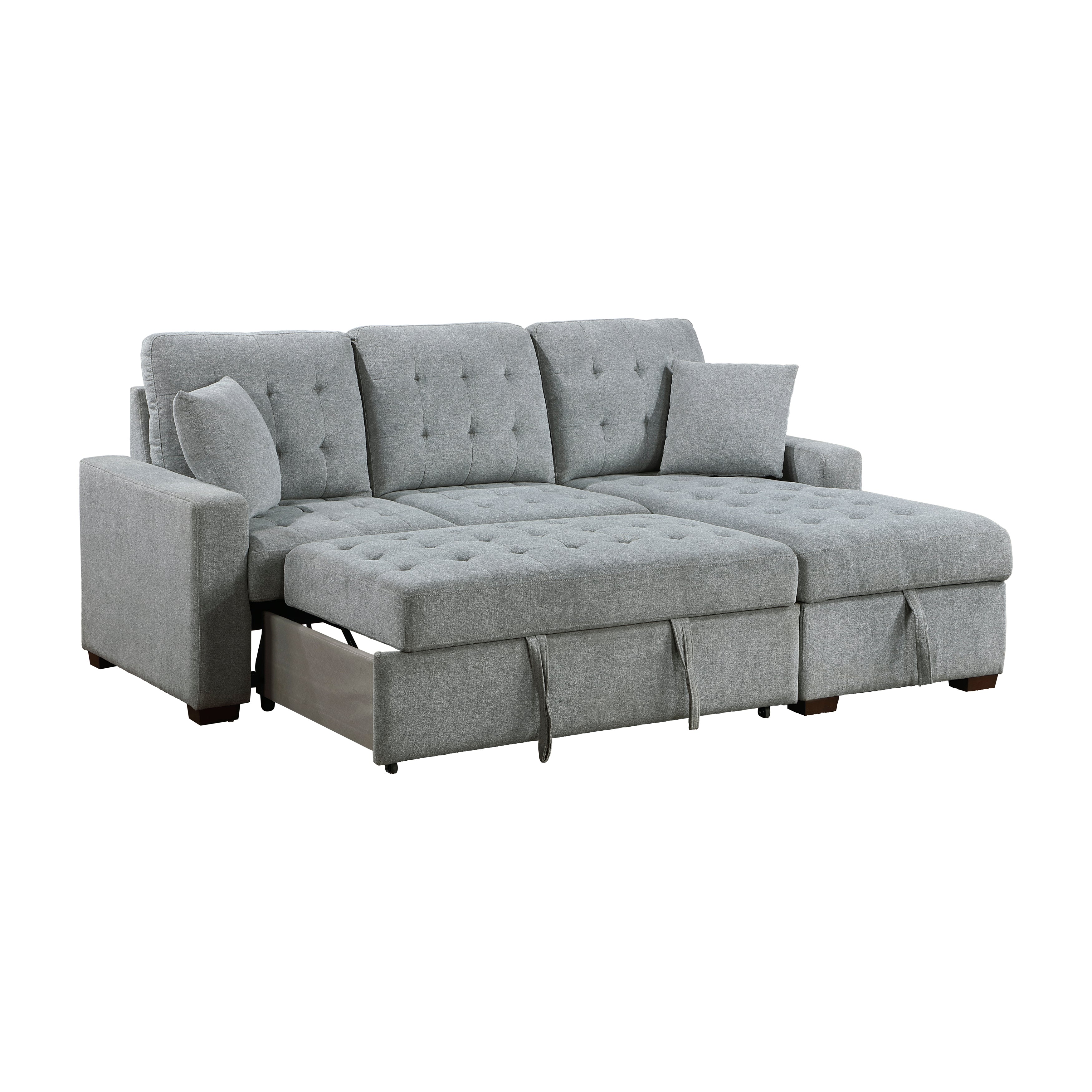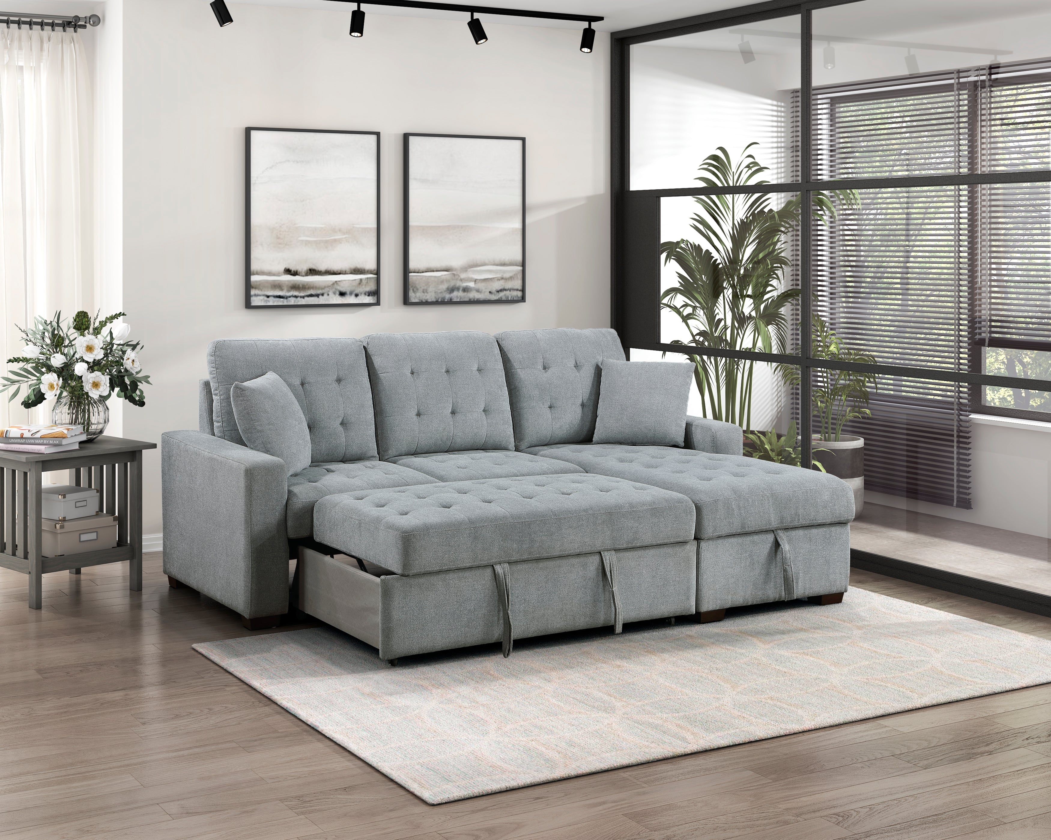 Expanding your seating area to include functional sleep space, the Waitsfield Collection is a versatile addition to your home. Gray velvet upholstery covers the sectional with stitch tufting lending a decorative touch. The left side 2-seater features a pull-out bed while the right-side chaise has a lift-top hidden storage unit beneath the seating area.