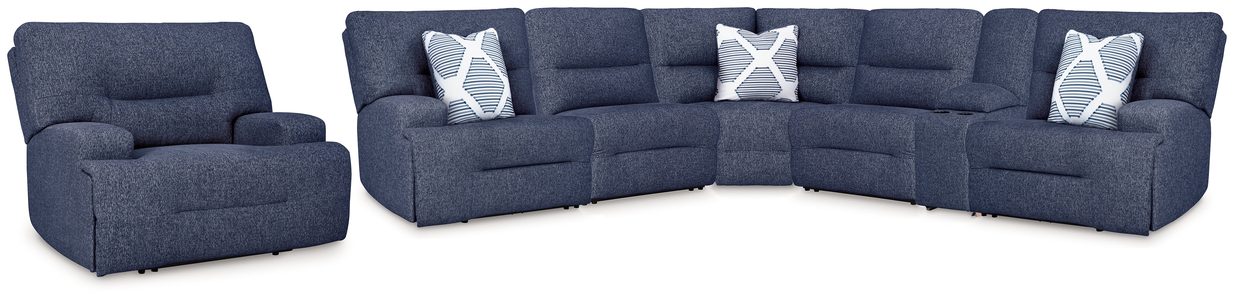 Includes 7 modular pieces: left-arm facing power recliner, console with storage, wedge, oversized power recliner, right-arm facing power recliner and 2 power armless recliners