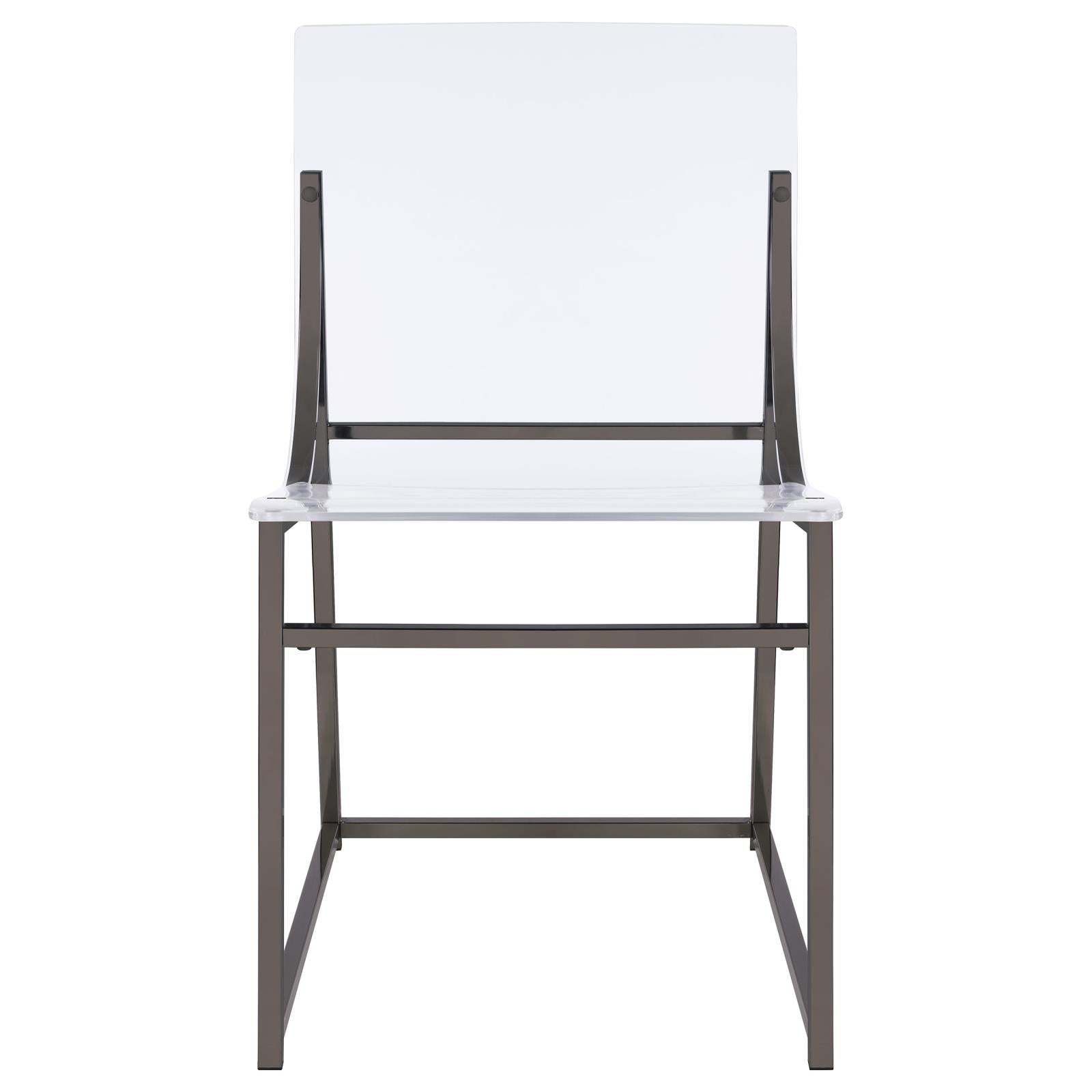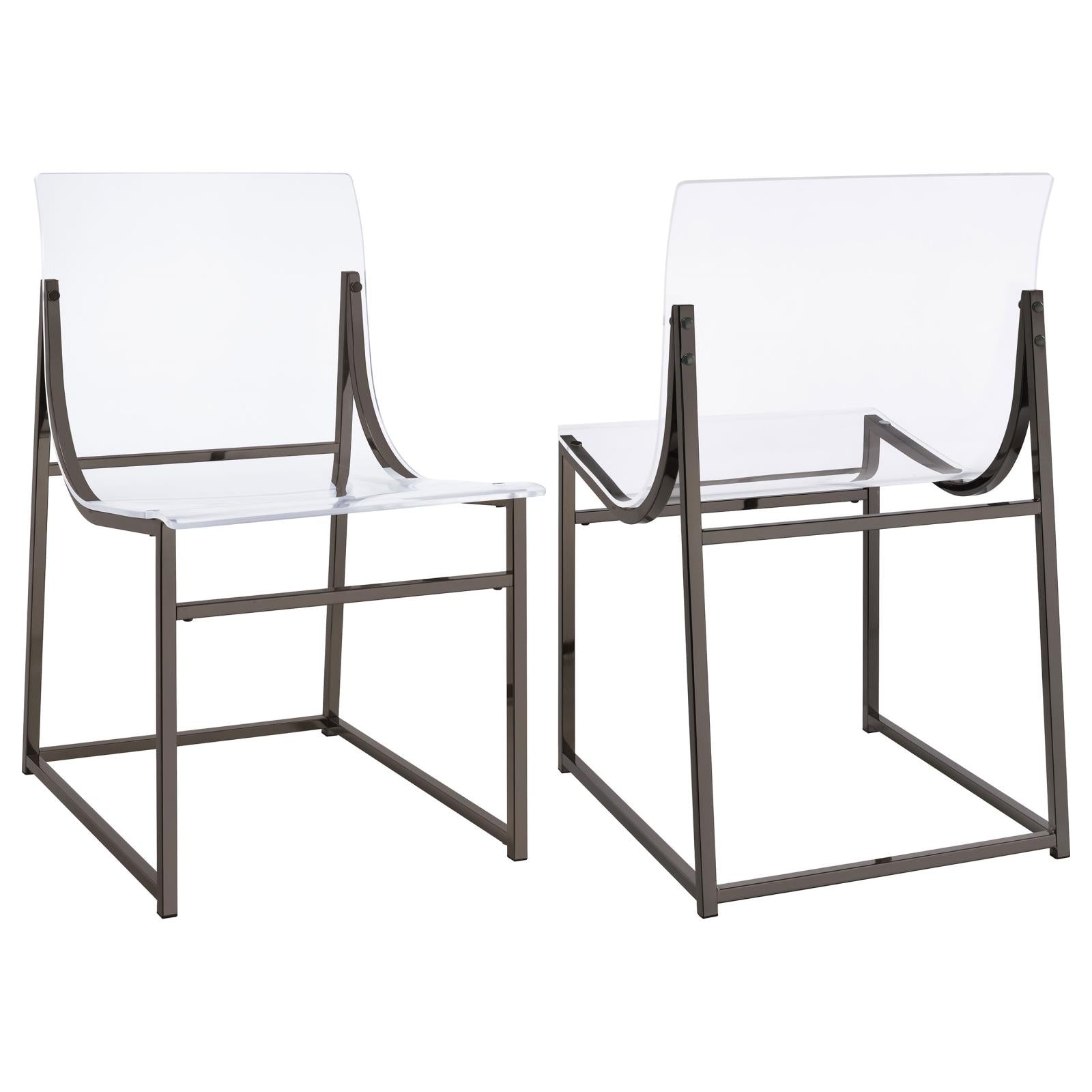 Step into the world of nouveau interior design with chairs that will turn conventional style on its head and become a central focus in your contemporary living environment. Customized for the experimental stylist, this set of two side chairs deliver surprising comfort, dabbling in a mix of materials striking a balance between industrial classic and pop culture retro design aesthetics. A metal frame with subtly rounded angles and straight lines forms a no-fuss look that relies on trending simplicity. A clear acrylic sheath is sturdy enough to support weight and provide a peek-a-boo view of the frame back. Paired with a table that duplicates its creative design, these chairs add unforgettable personality.