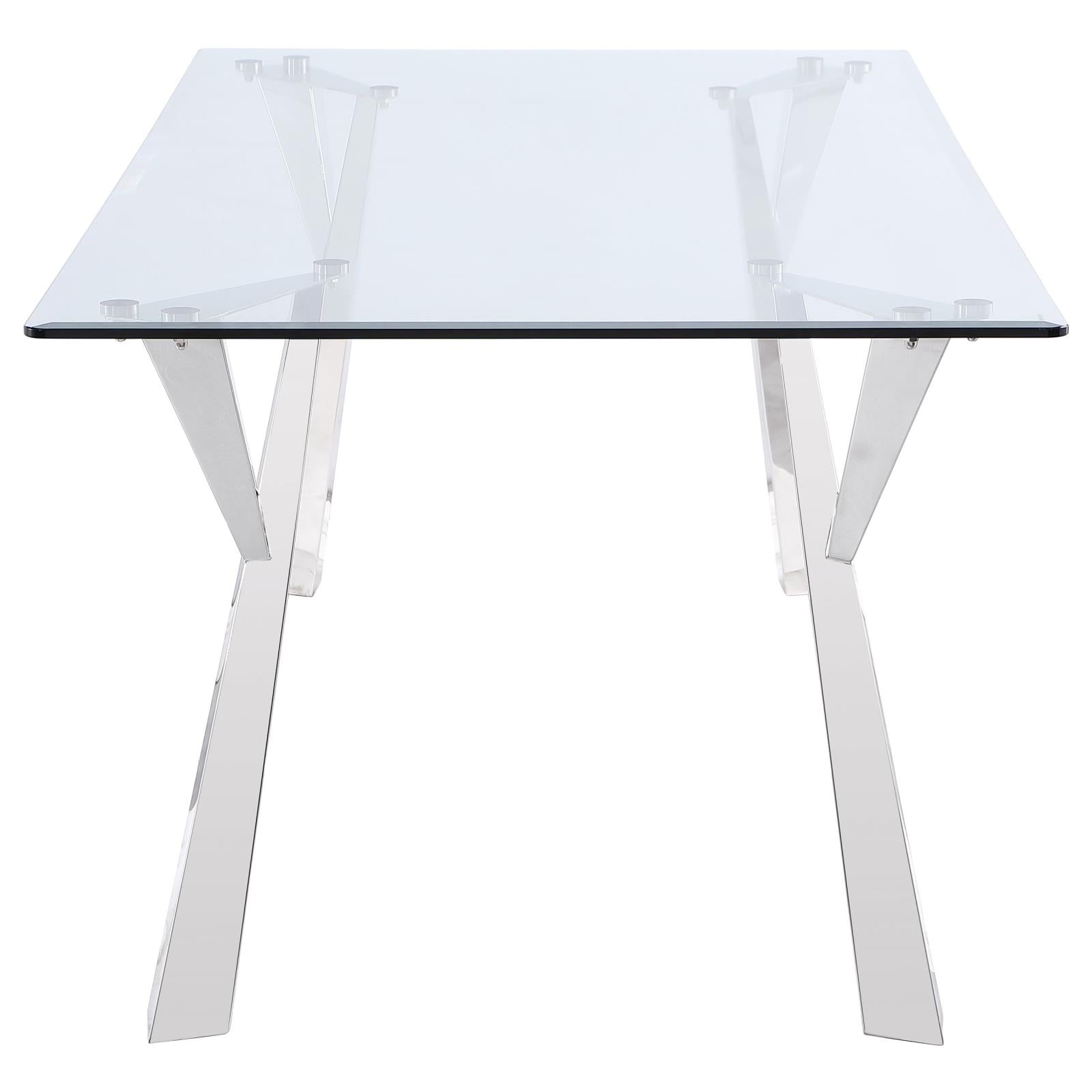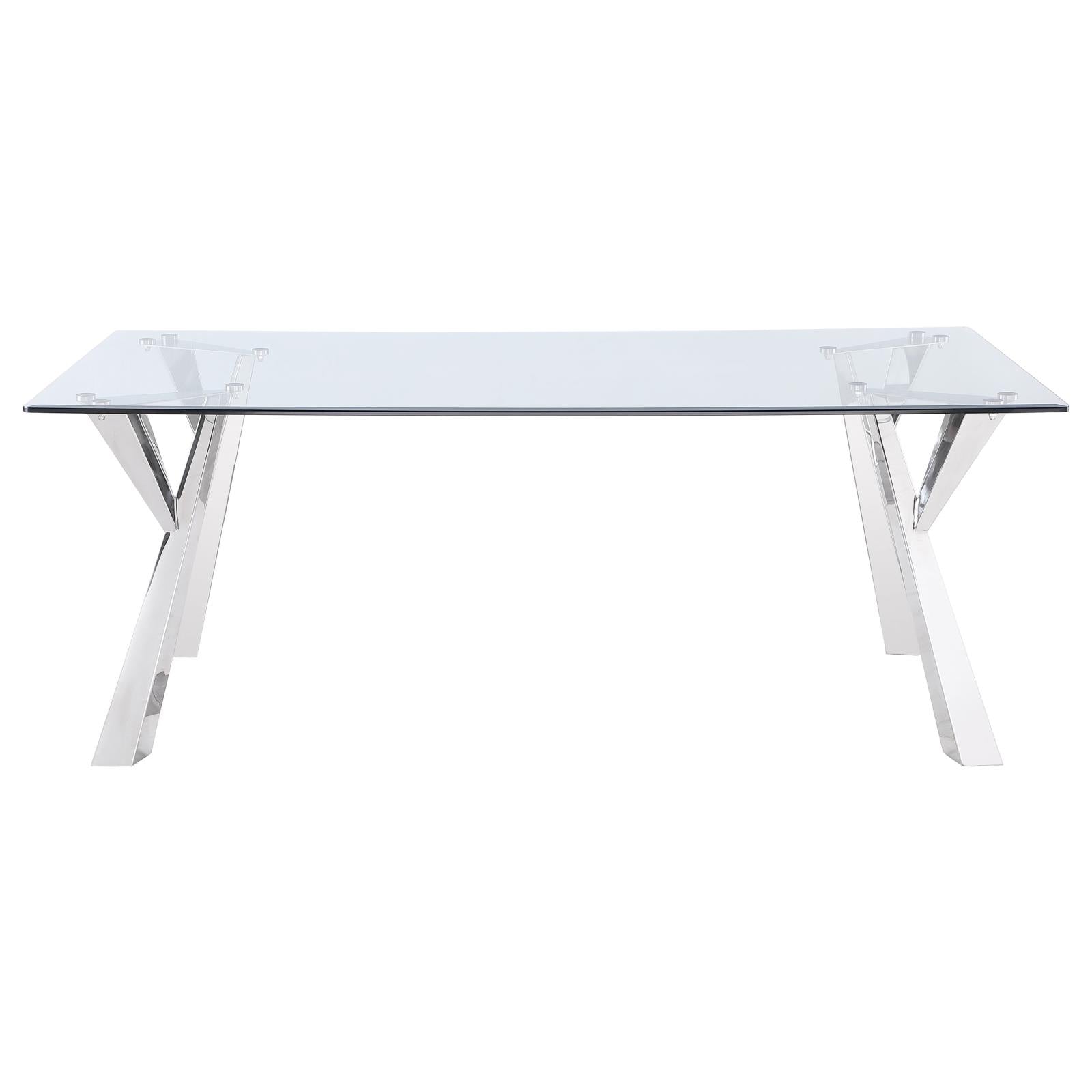Sculptural style instantly elevates the modern glam aesthetics of a contemporary dining table. The rectangular table is topped with beautiful clear glass, complete with an elegant beveled edge for a polished look and feel in your dining room. Flared, geometric legs add sophistication and artistry, certain to capture attention for everyday dining or elegant entertaining of friends and family. A polished chrome finish brightens the look of the table and offers a neutral complement that glistens in the light. Clean and precise in style, this modern dining table is a gorgeous choice for your sophisticated space.