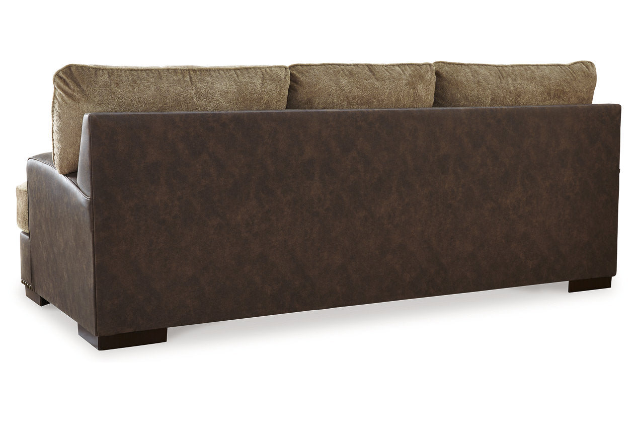 Punctuated by a subtle band of nailhead trim, this sofa is perfect for those who love the look of leather. Two textural tones provide twice the style and comfort—and incorporate an added layer of visual interest. Throw pillows add a fun decorative element. Matching oversized chair, swivel chair and ottman included. Luna Furniture introduces Alesbury Sofa, Oversized Chair, Swivel Chair and Ottoman to enhance the beauty of your living spaces.