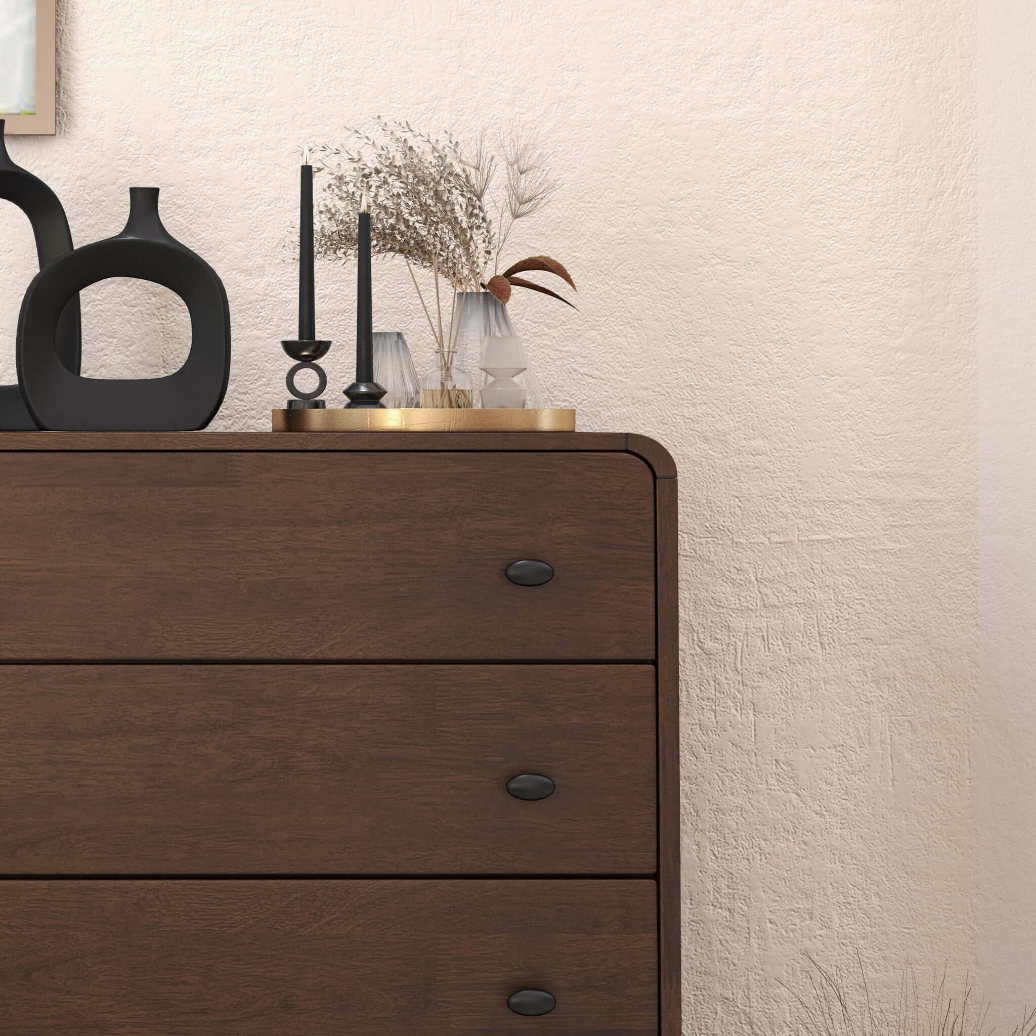 Complete your urban home bedroom furniture decor with these stylish mid-century modern five-drawers, tall dressers & chests of drawers. It's not and only closet storage important addition to any stylish bedroom furniture set. This modern bedroom dresser offers six spacious drawers that open and close smoothly, with sliders as drawer organizers. Its spacious drawers are perfect for storing easy bulky clothes to help you tide up all bedroom clusters. This aesthetic front solid wood drawer of closet organizer's flat top surface is suitable for your electronics, books, and lamp. Elevation of your bedroom set starts with this contemporary clothes organizer console table. This chest of drawers can be a massive addition to storage space in the master bedroom, guest room, kids' room, entryway, dining room, game room, and all living spaces! This functional dresser for the bedroom is constructed with kiln-dried solid wood with a walnut color. Rich wood wins are shown great on this natural wood dresser. Metal knobs and tapered spayed solid hardwood legs are durable and elegantly attached to make mid century modern accent. These bedroom dressers are built with all-natural materials that comply with TSCA regulations and ASTM International's industry-standard ASTM F2057-19 Safety Specification for Clothing Storage Units. It comes with tip-over protectors to install, intended to reduce hazards to children five and under due to furniture tip-over. Unlike other cheap dressers in the market, this product ships semi-assembled with simple feet assembly required, which takes approximately 10 minutes. Pre-assembly will significantly improve stability and save you time and money.