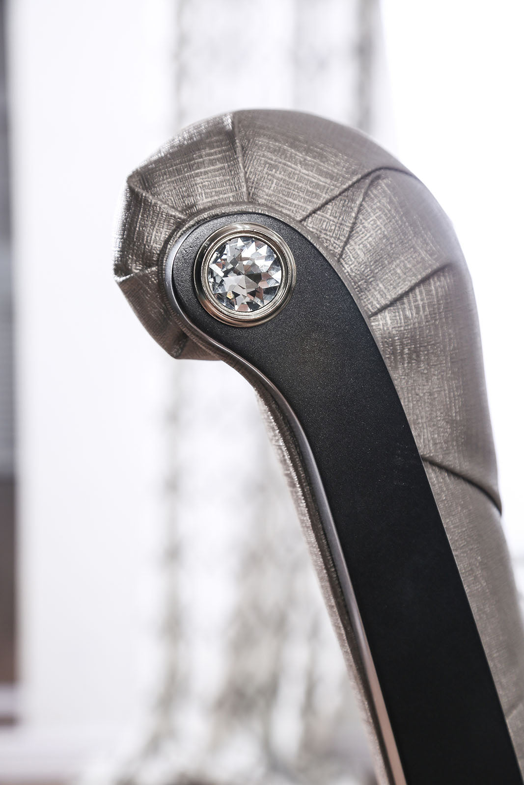 This dining collection will be the focal point of any home with its cool gray finish and elegant structure. Padded faux leather upholstery comes adorned with crystal-like acrylic buttons while the side chairs are additionally emphasized by their sophisticated scrolled backs. This dining set is the perfect statement addition to any dining area.