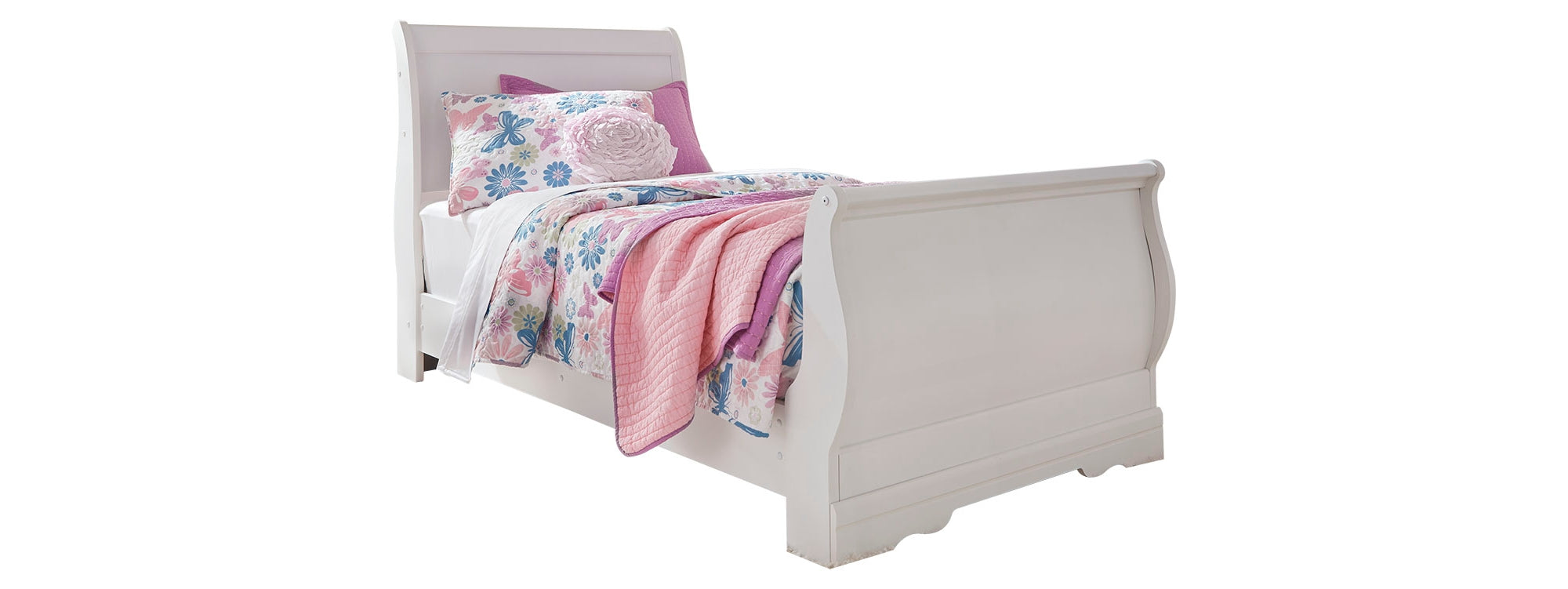 This twin sleigh bed's crisp cottage white gives traditional Louis Philippe profiling a delightful style awakening. The look is timeless. The feel? Right at home. Mattress and foundation/box spring available, sold separately. Luna Furniture introduces Anarasia Twin Sleigh Bed to enhance the beauty of your living spaces.