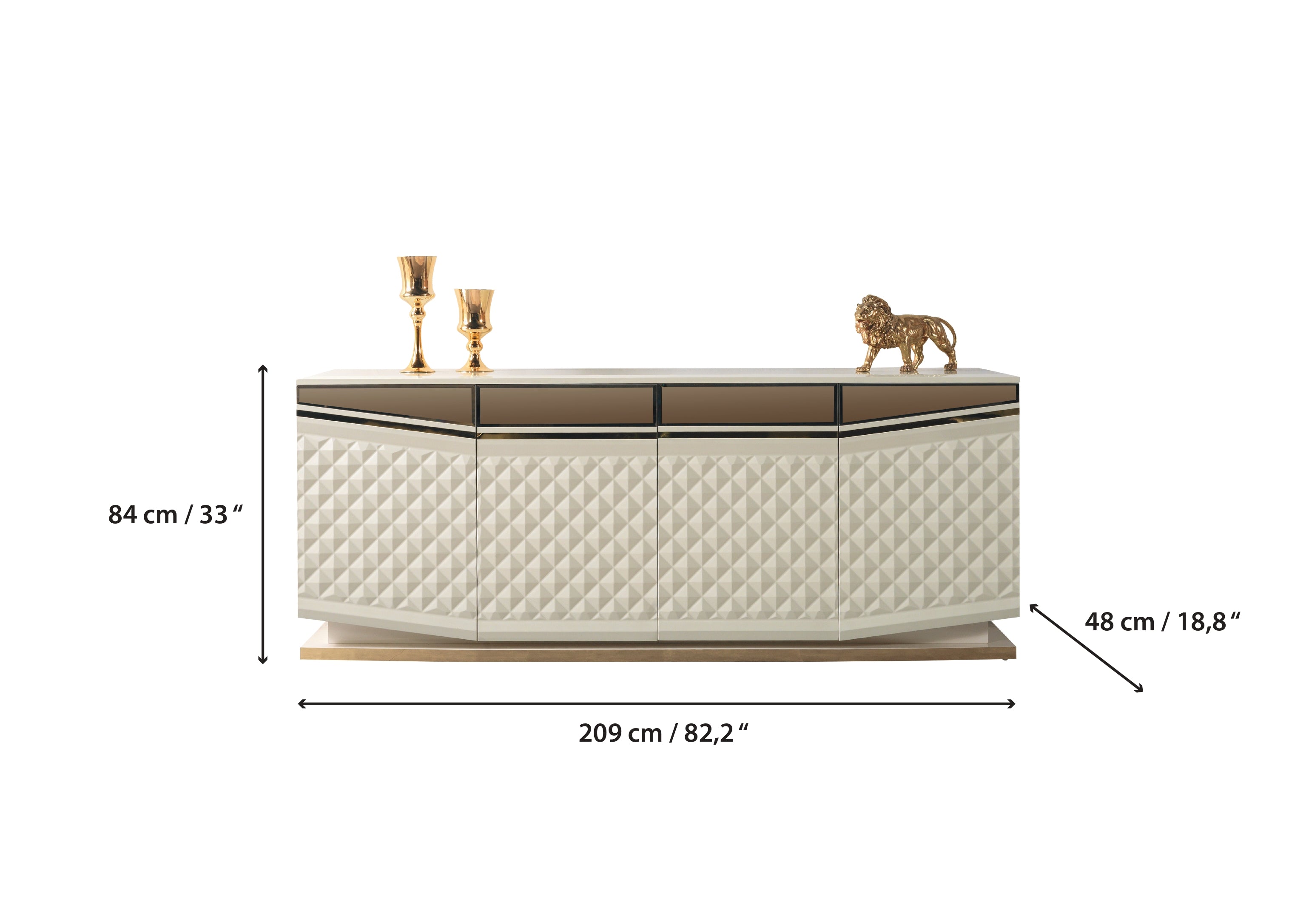 Elevate your dining space with the Anica Ivory Dining Server, a stunning blend of glam sophistication and modern function. Designed to impress, this piece features a high-gloss ivory finish with intricate 3D geometric detailing across the front doors, bringing texture and depth to your room. The mirrored top trim and soft gold accents enhance the luxurious feel, while the spacious cabinet design offers discreet storage for your finest dinnerware or entertaining essentials. Whether used as a buffet, sideboard, or display piece, this server adds elegance to any space. Luna Furniture introduces the Anica Ivory Dining Server to enhance the beauty of your living spaces.