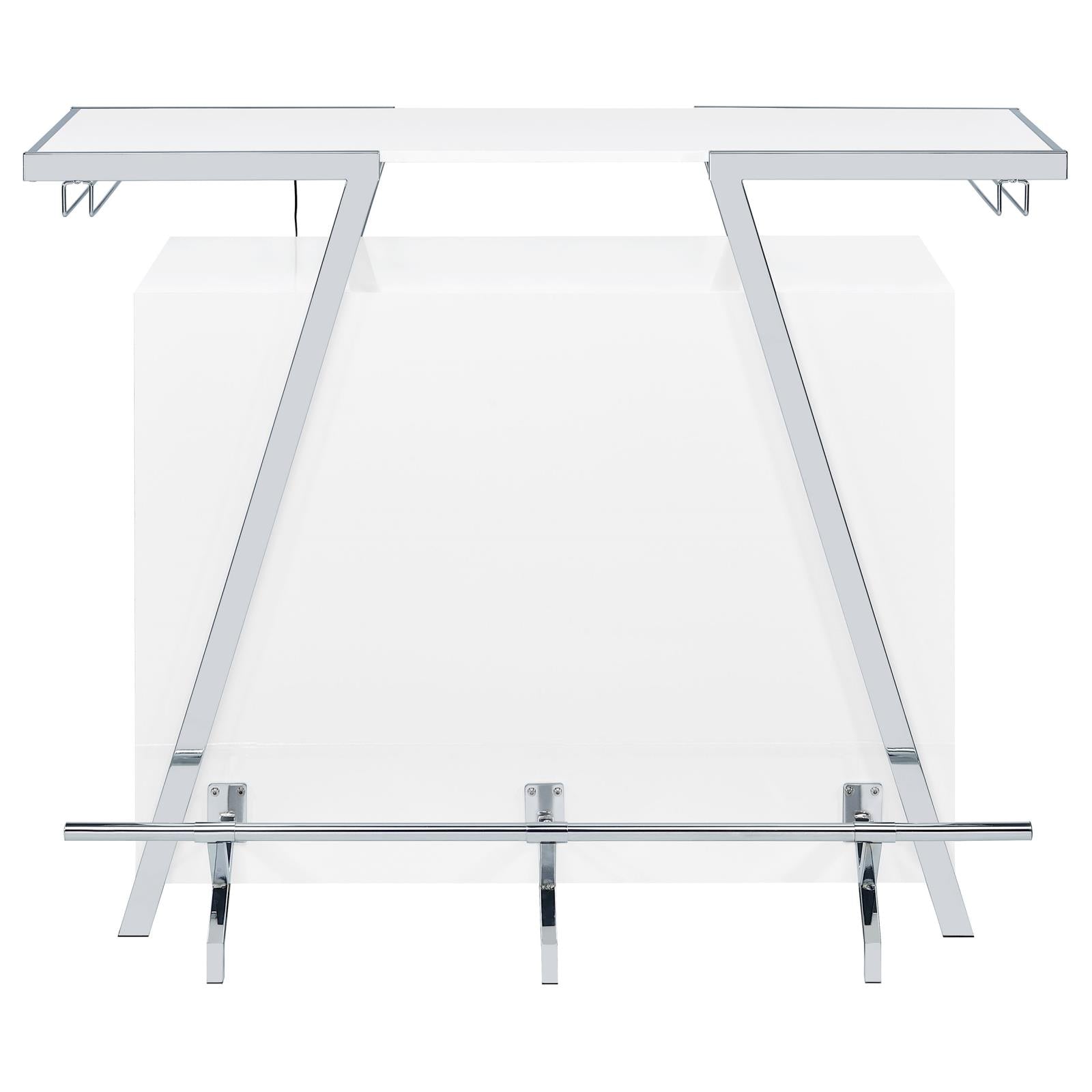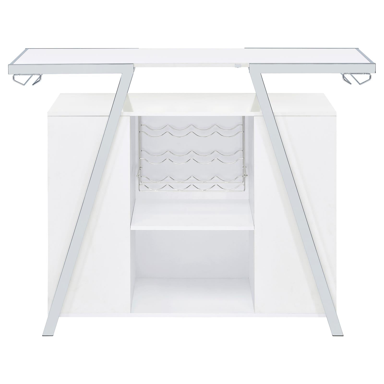 Pull out all the stops to breathe fresh energy and organization into a casual space dedicated to entertainment. Your needs are met with this modular-inspired and contemporary home bar constructed of MDF, paper coating, and veneer, all with a bright white finish. Metal framing is jazzy with a geometric motif, supporting a spacious top shelf ideal for beverage and snack prep. A center compartment features shelving and bottle racks, while the integrated LED strip located on the underside of the table top can change color. This handy bar unit transforms a compact space into a modern home-based venue for fun.