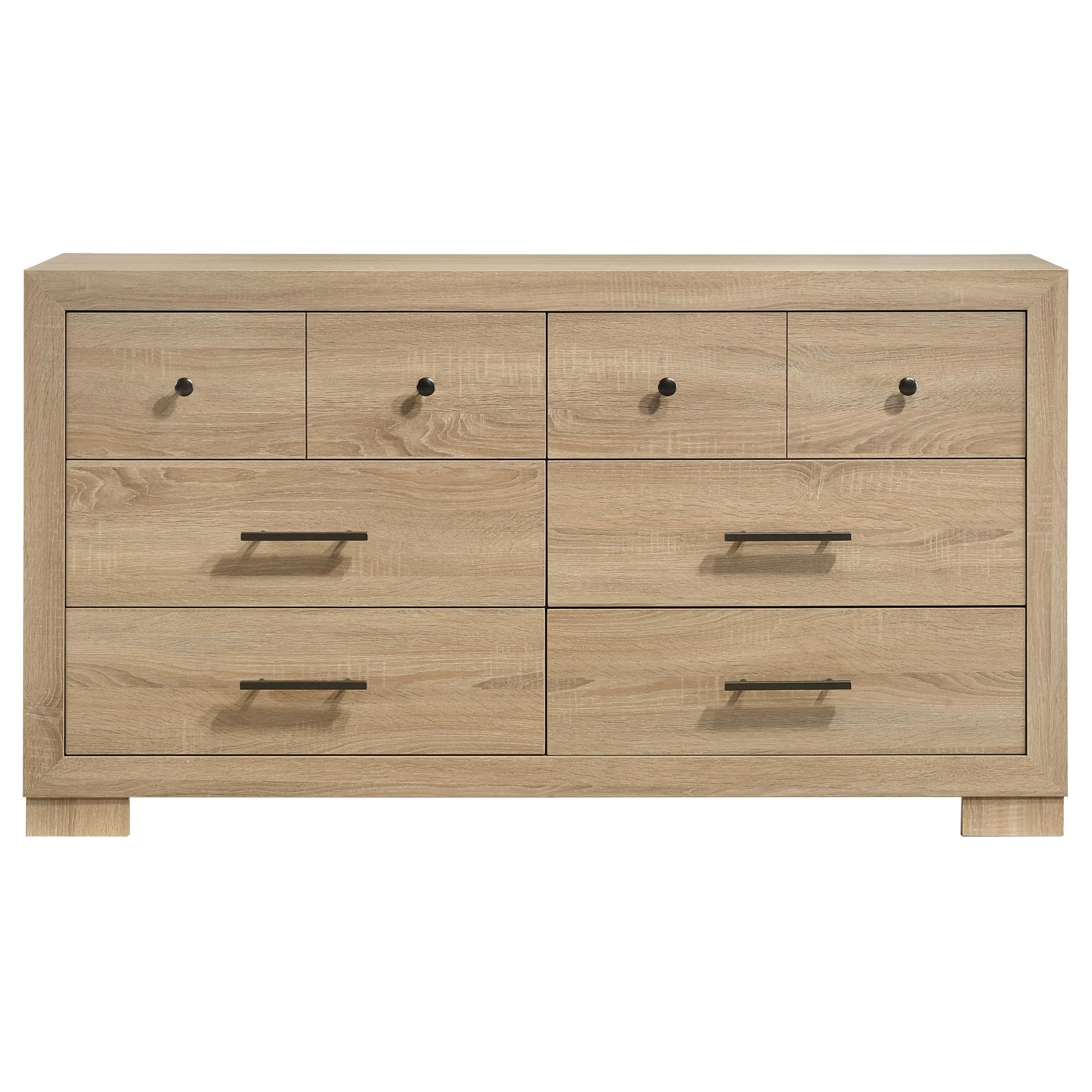 A study in understated elegance, this six-drawer dresser blends modern simplicity with everyday functionality. Its streamlined profile is finished in a soft light oak hue, complemented by antique nickel hardware for a subtle touch of shine. Crafted from engineered wood and finished in a scratch-resistant laminate veneer, it offers durability and beauty in equal measure. Six English dovetail drawers glide effortlessly on metal extension glides for seamless storage.