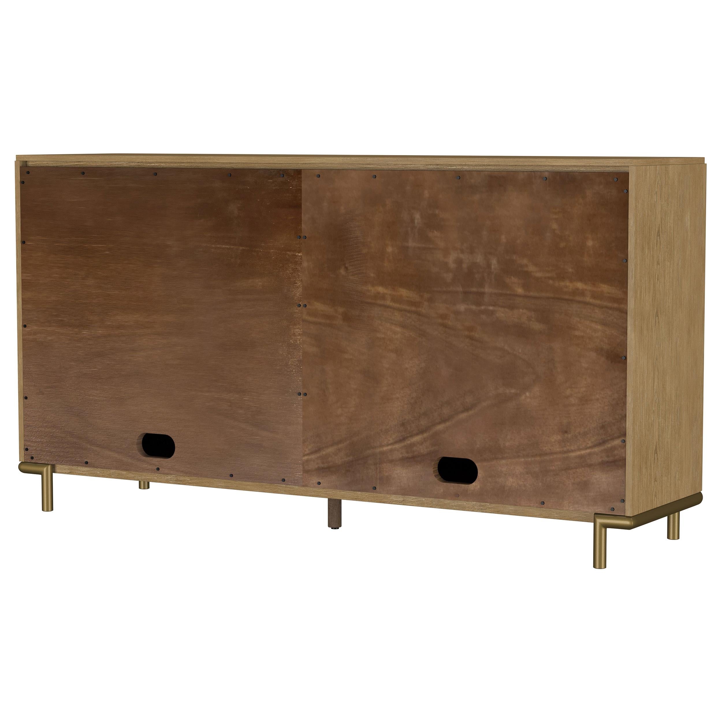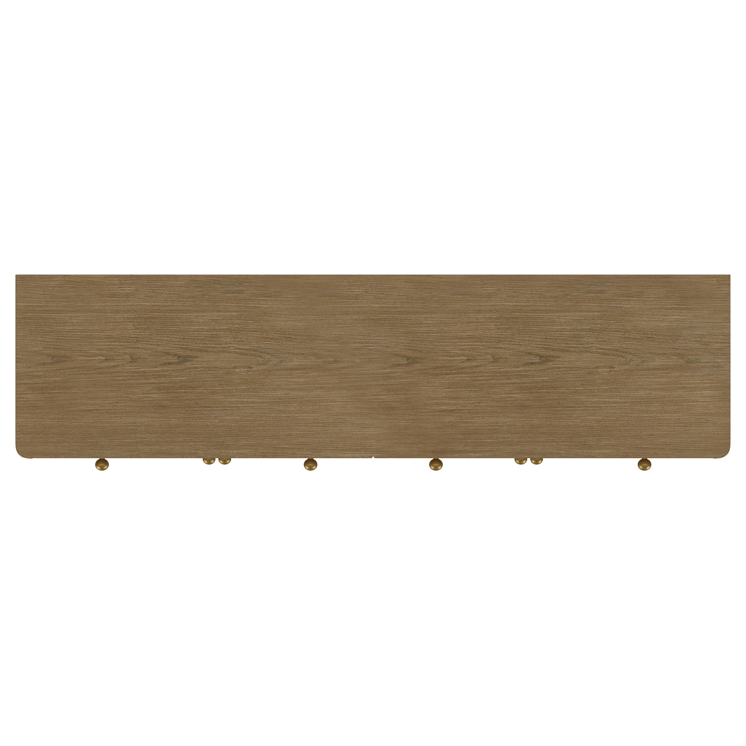 This 65-inch sideboard combines modern sophistication with organic charm and exceptional functionality. Featuring handcrafted woven cane door panels from Indonesia, it adds natural texture to any space. Constructed from solid Asian hardwood and white ash veneer, its refined craftsmanship is enhanced by a 17-step finishing process. Felt-lined drawers with English dovetail construction glide smoothly on 45mm metal ball-bearing tracks, while soft-close Euro-hinged doors and adjustable shelves offer practical storage. Antique brass knobs and legs complete the elegant design.