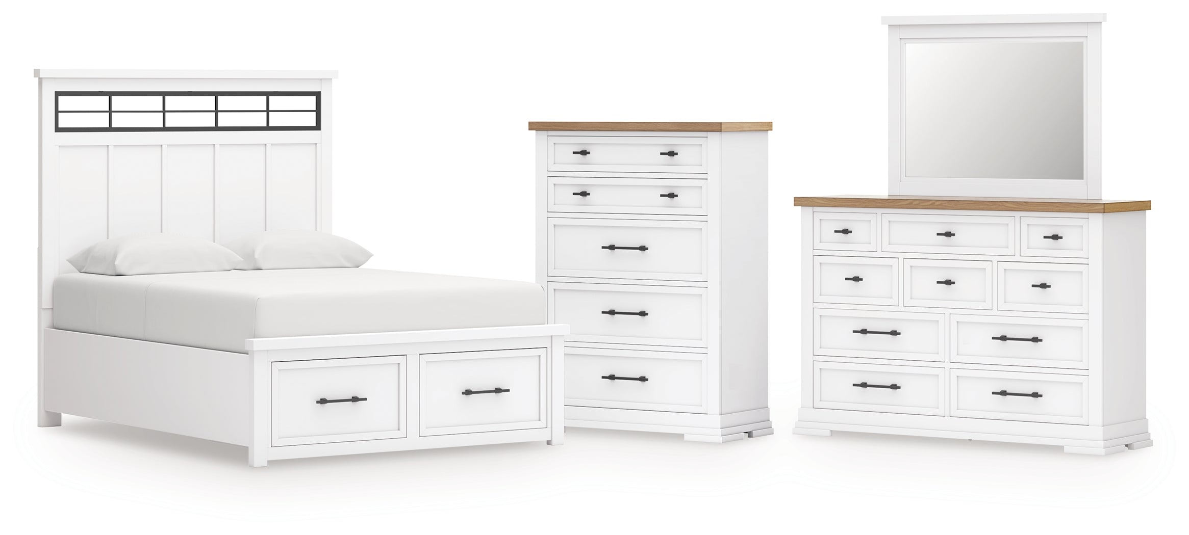 Ashbryn King Panel Storage Bed with Mirrored Dresser and Chest in White/Natural