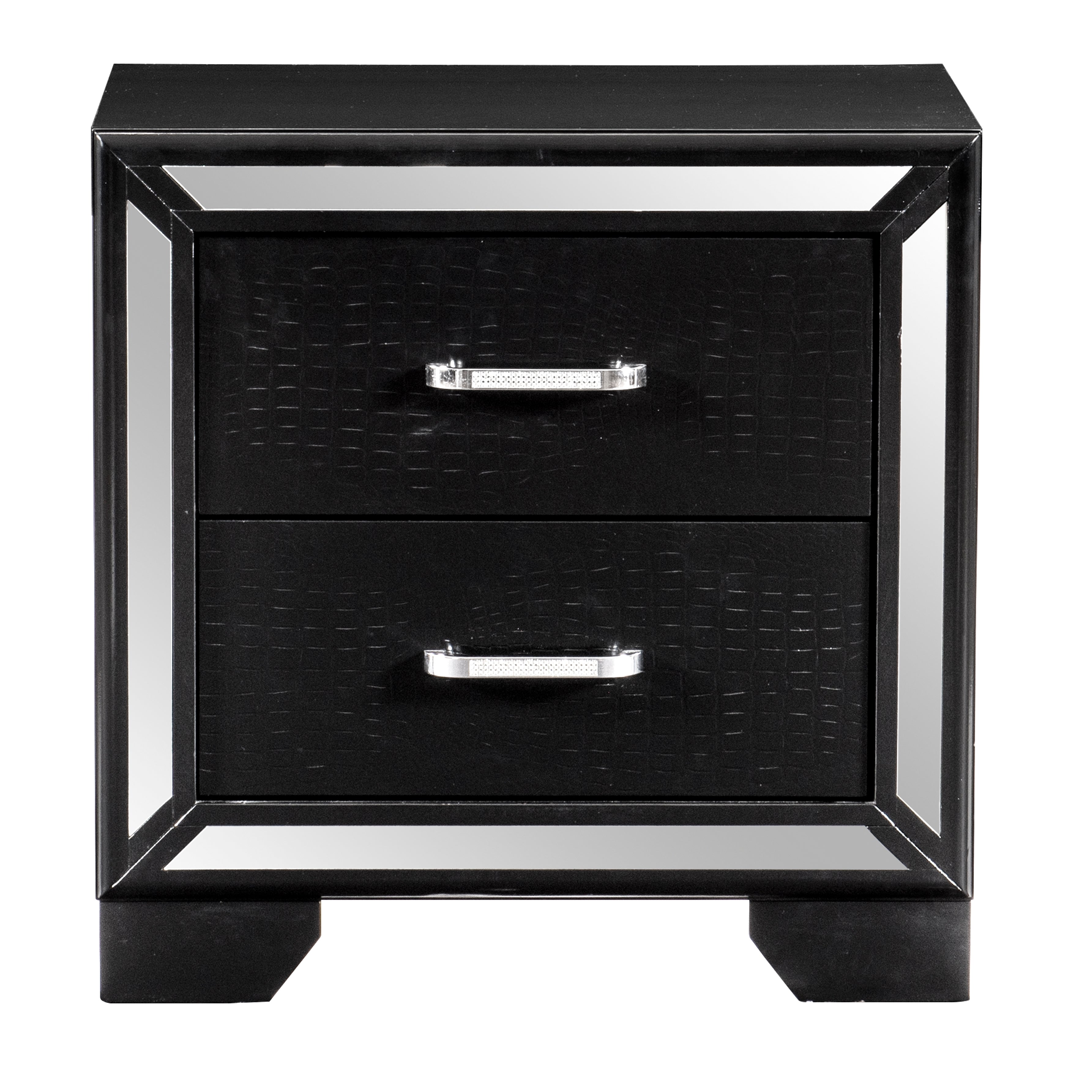 Elegant touches abound with the design of the Aveline Collection. Alligator embossed veneer covers the collection and is finished in black, an elegant palette that beautifully pairs with your bedroom’s accessories. The nightstand is framed with mirror trim, while the drawers are fronted with chrome-finished faux-crystal inlay bar hardware, each accent a perfect decorative touch to reflect your glamorous style.