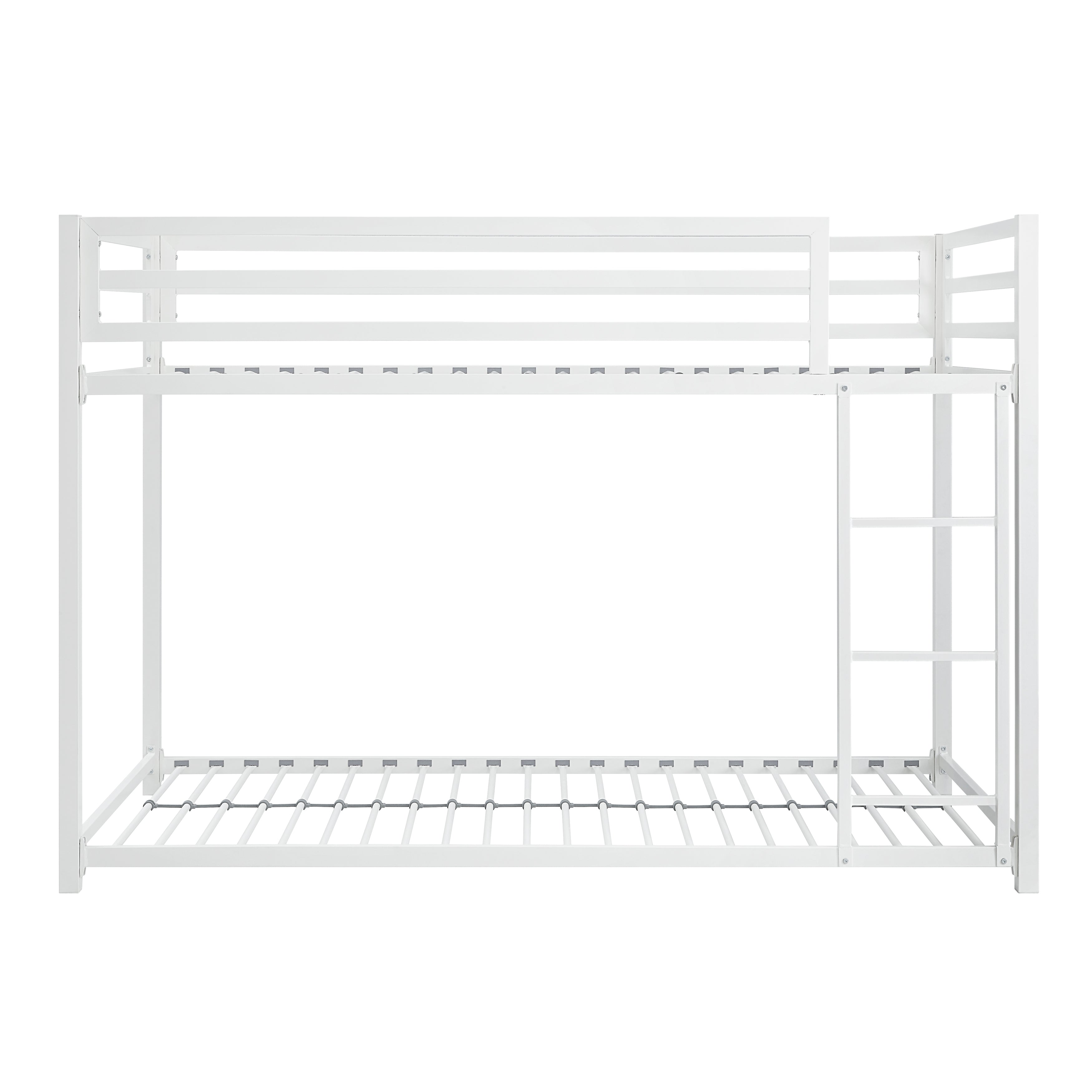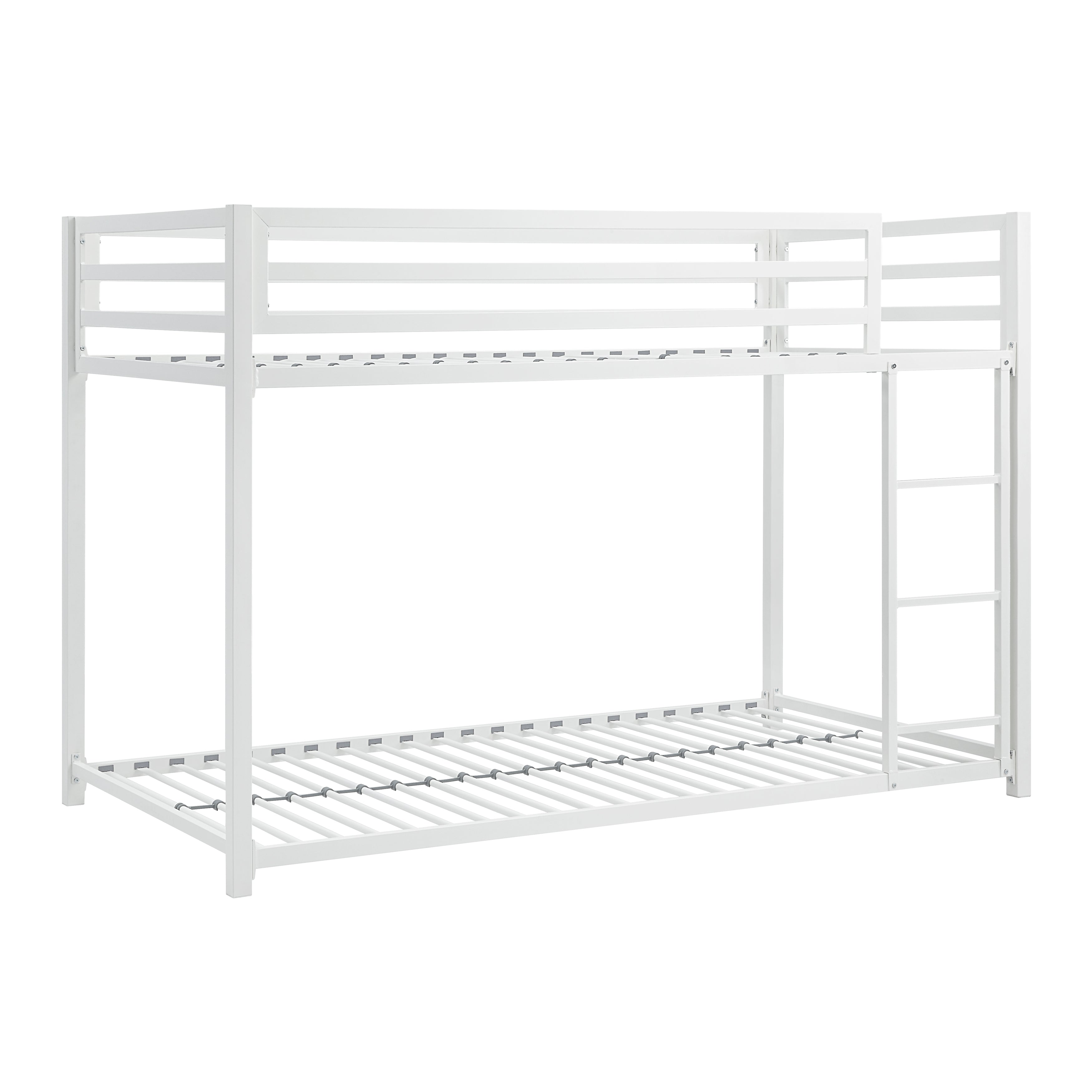 The Jovie Collection provides a creative sleep space solution for your children’s bedroom. The ground-level platform of the twin-over twin bunkbed is a unique twist on the look of the stacked bedroom staple, making bedtime a breeze, while calling dibs on the top twin bunk is made easy with the mounted ladder. Constructed of metal framing and finished in white, the bunkbed is a neutral canvas for the creative stylings of your children’s wildest dreams.
