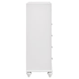 Complete the decor of your personal space in stunning, sparkling style. Beautifully adorned with acrylic glitter panels, this five-drawer dresser transforms any bedroom into a glamorous retreat. Faceted crystal hardware adds an extra pop of polish. A crisp, clean white finish gives it a posh yet pristine look. Pair this wooden chest with matching bedroom furniture for a spectacular ensemble that's fit for modern royalty.