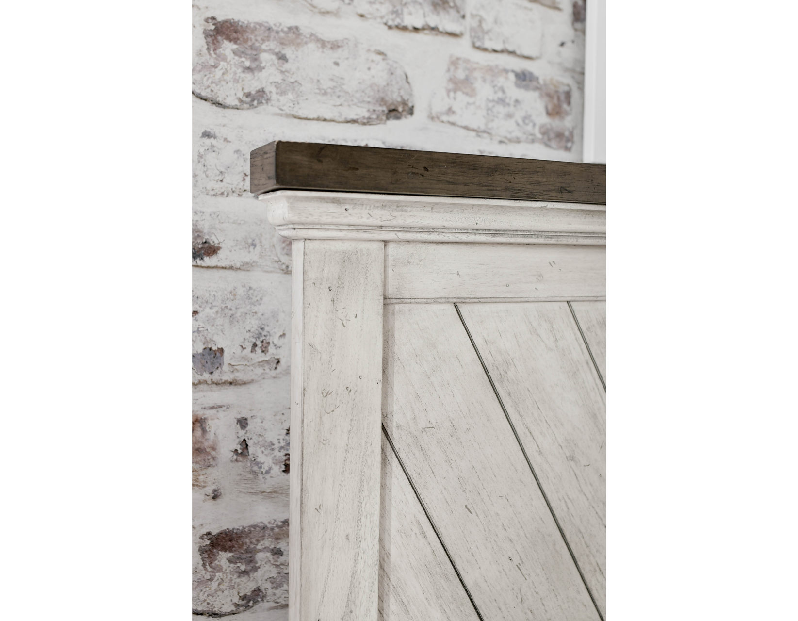 • Styling details include chevron patterned headboard and footboard with planked-effect drawer fronts and antiqued pewter finish hardware.