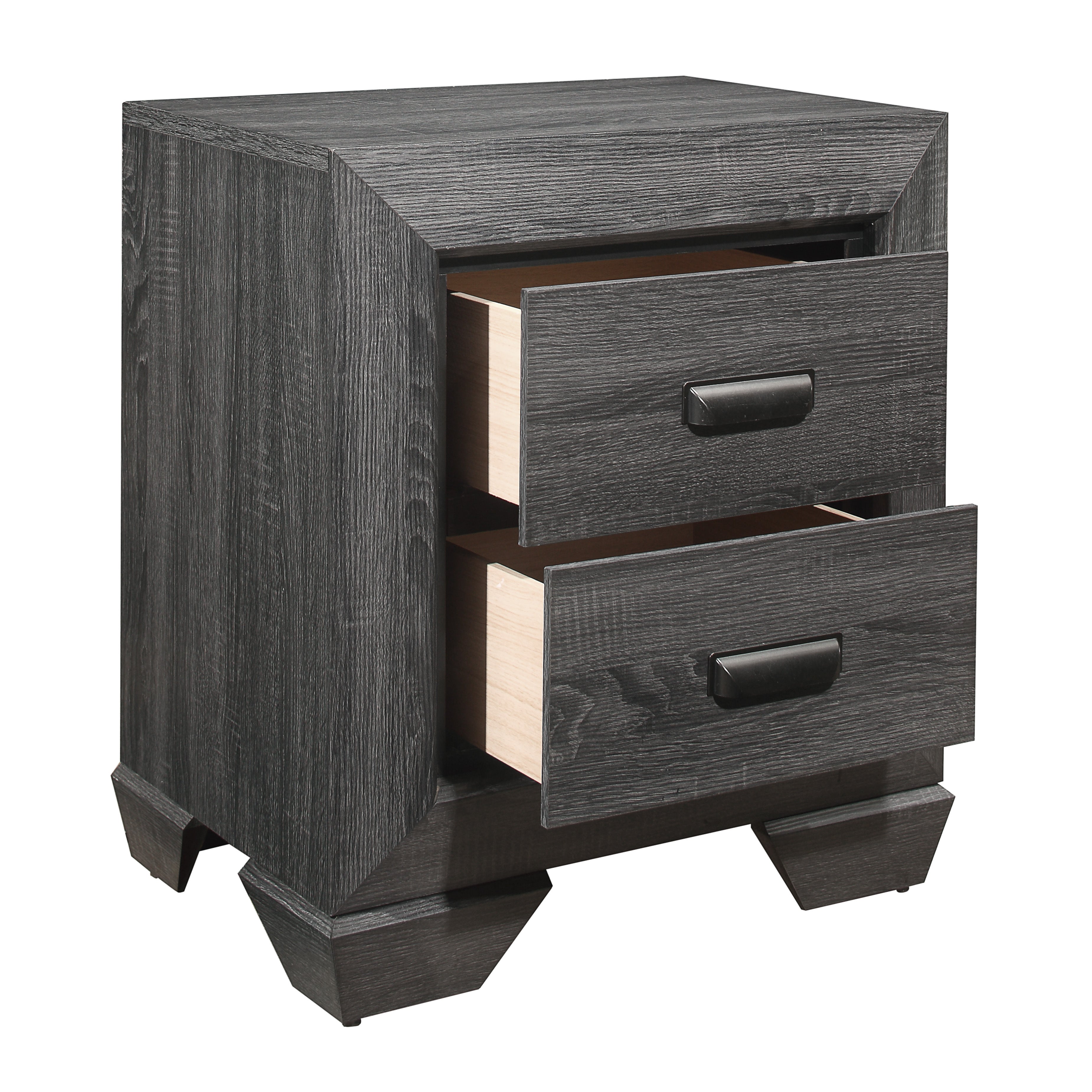 Blending the elements of contemporary design and rustic aesthetic, the Beechnut Collection is a unique addition to your master, youth or guest bedroom. Dark under-paneling serves to highlight the two available finish options of the collection – gray or natural – both enhancing the embossed faux-wood veneer of the raised panels on the bed and case goods. Contrasting cup hardware punctuates each drawer front.