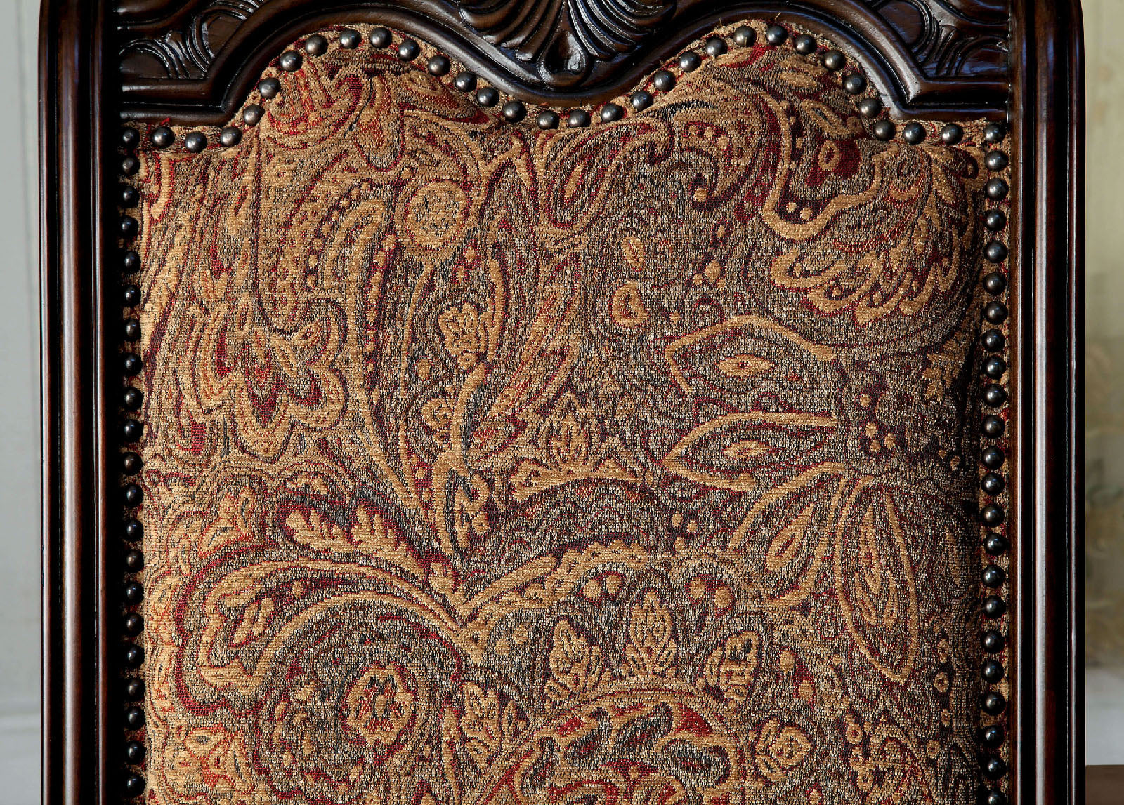 Three side chair options are offered, a leather-like fabric chair and a wooden chair, each with its own unique styling. In addition, a matching mirror and server are also available to complete this that beautifully crafted dinning set.