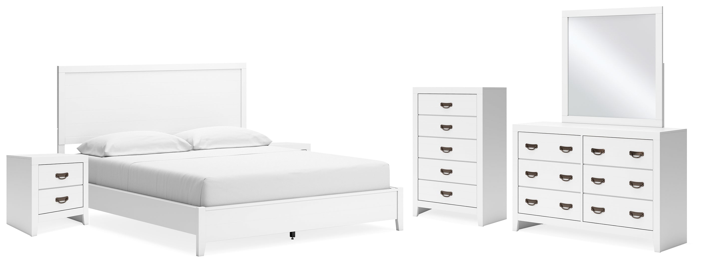 Binterglen California King Panel Bed with Mirrored Dresser, Chest and 2 Nightstands in White