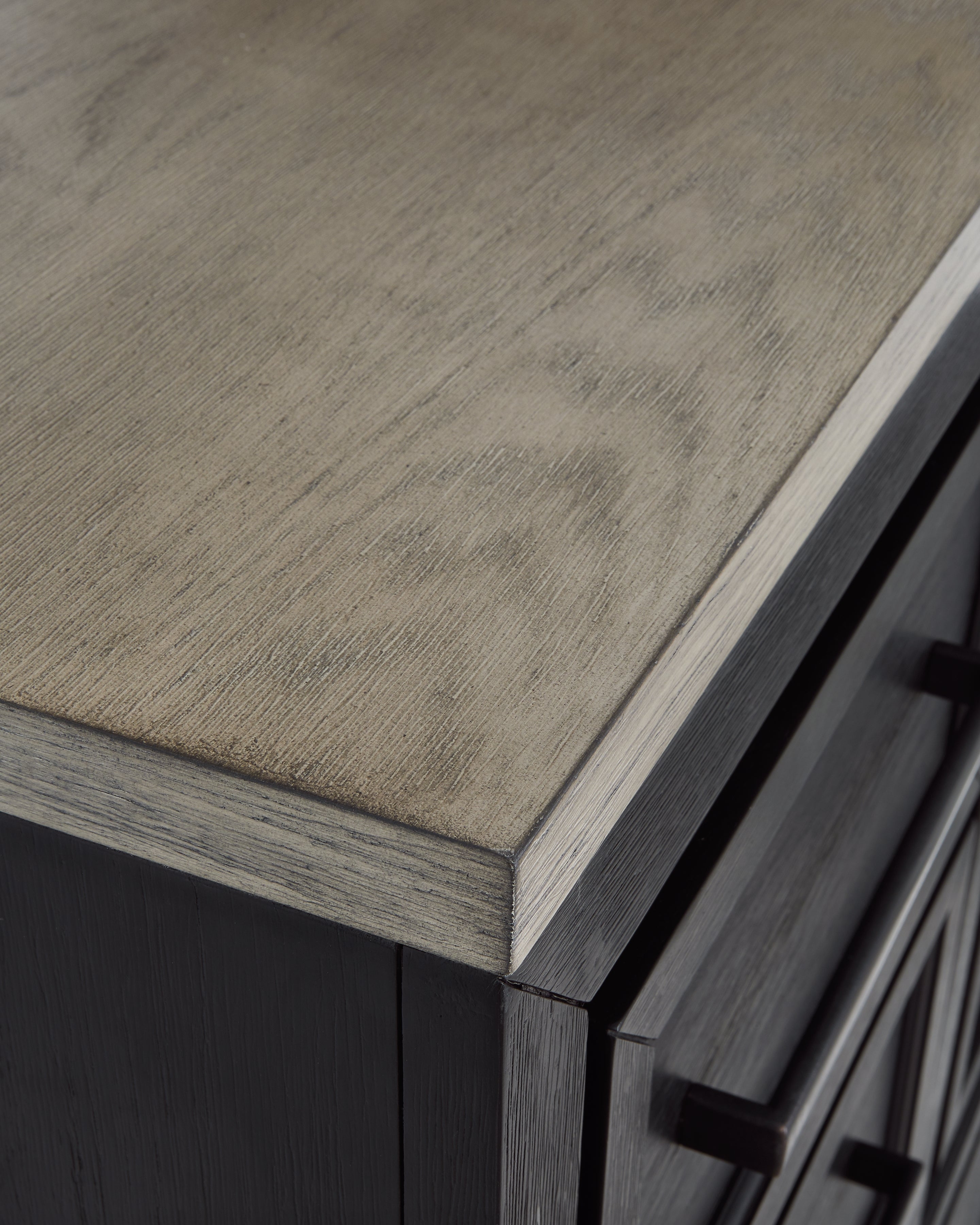 This bedroom package is casual contemporary style simply done right. Its two-tone color scheme features a rich brushed black main color accented with a beautiful dusty grayish brown wood tone. What a chic approach to relaxed yet refined design.