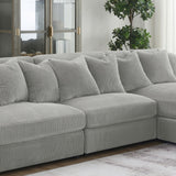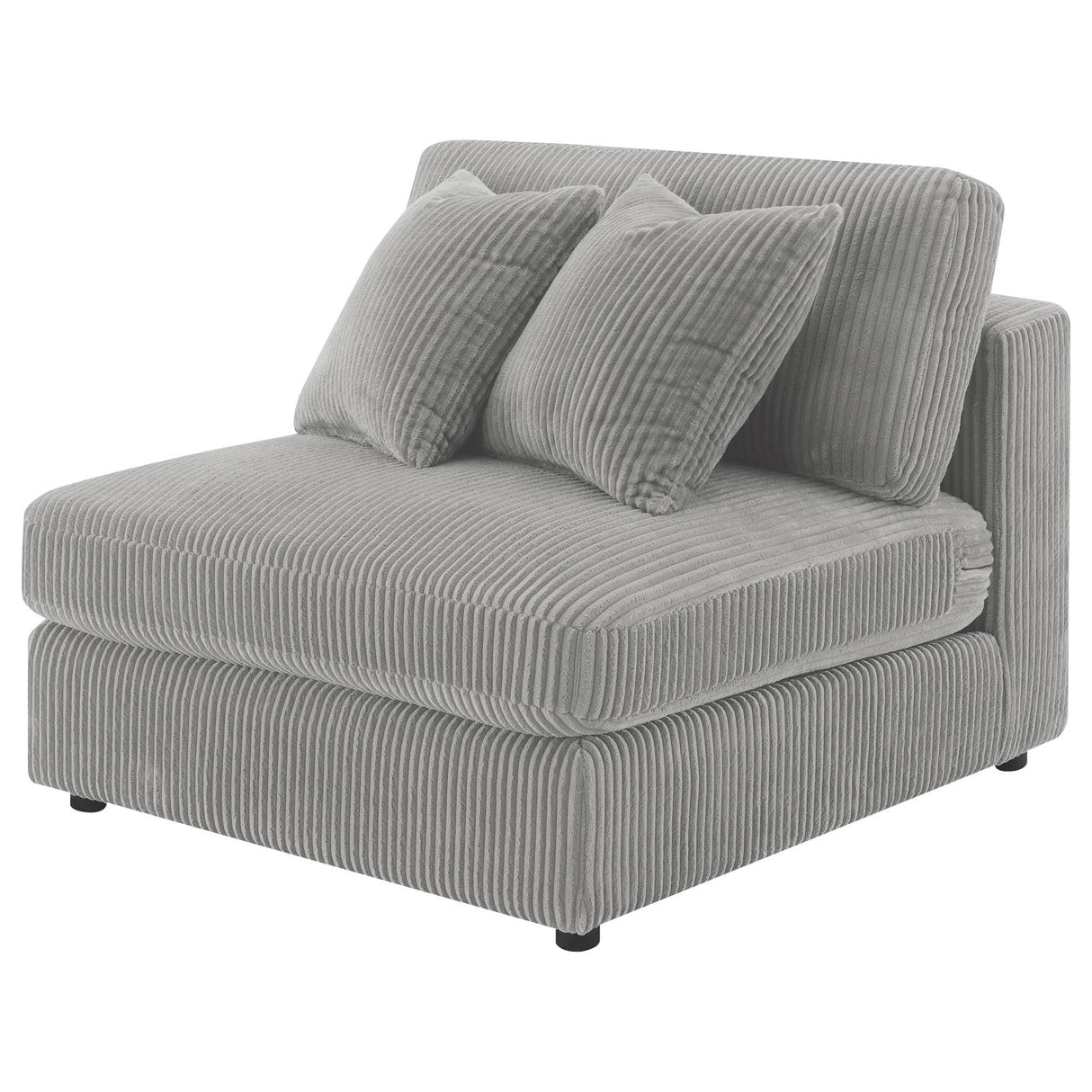 Instill cozy and inviting energy in your den or living room with a modern armless chair. Plush and comfortable, it features soft cushions and wide wale corduroy style upholstery in a soft neutral hue, perfect for augmenting existing seating. The seat and back cushions are each reversible, adding versatility and perfect for families and entertaining. Feet include non-skid grip to help keep the chair just where you place it within your space. Group couple by the fire, or add a cozy spot for reading and relaxing to your home office.