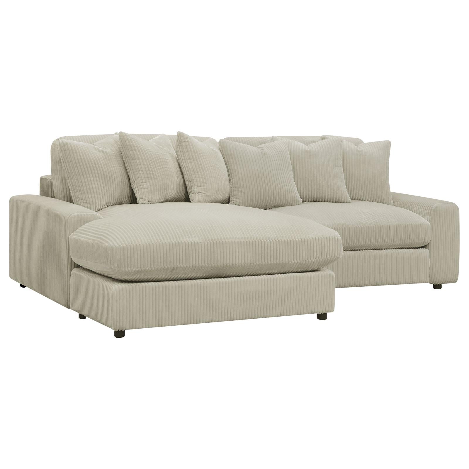Bring retro-inspired elegance to your contemporary seating environment with this modern reversible sofa and oversized chaise. Upholstered in vintage-like wide corduroy fabric, it offers a soft texture in elegant fog or sand tones. The two-piece design features reversible cushions, wide track arms, black legs, and non-slip grips for stability. Experience endless comfort with premium down-like filled cushions and pillows.