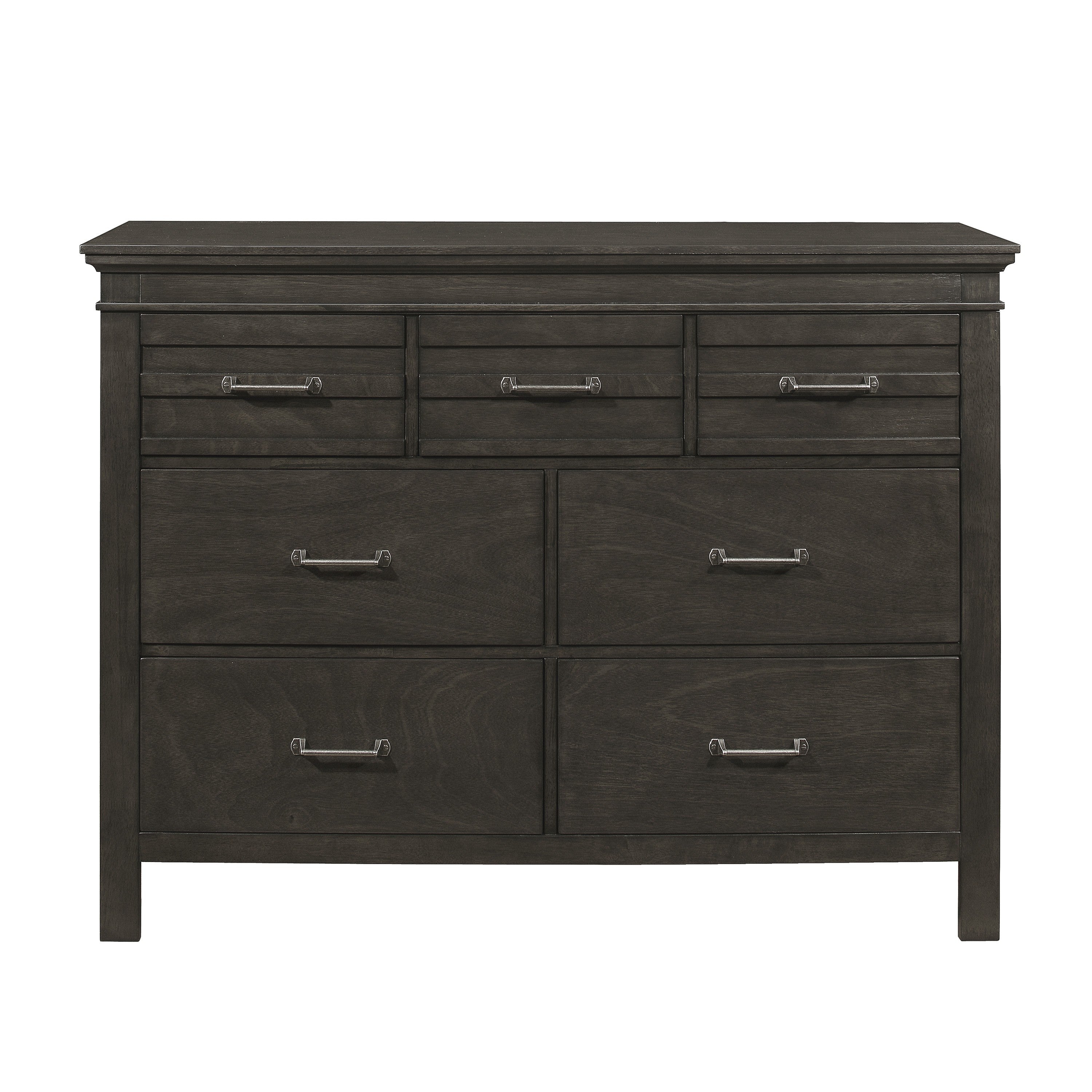 The transitional styling of the Blaire Farm Collection serves as the perfect complement to the rustic aesthetic that inspired the design. The okume veneer is enhanced by the charcoal gray finish that covers the dresser. Fixed handle pull hardware fronts the drawers while horizontal accents on the top drawers lend visual contrast.
