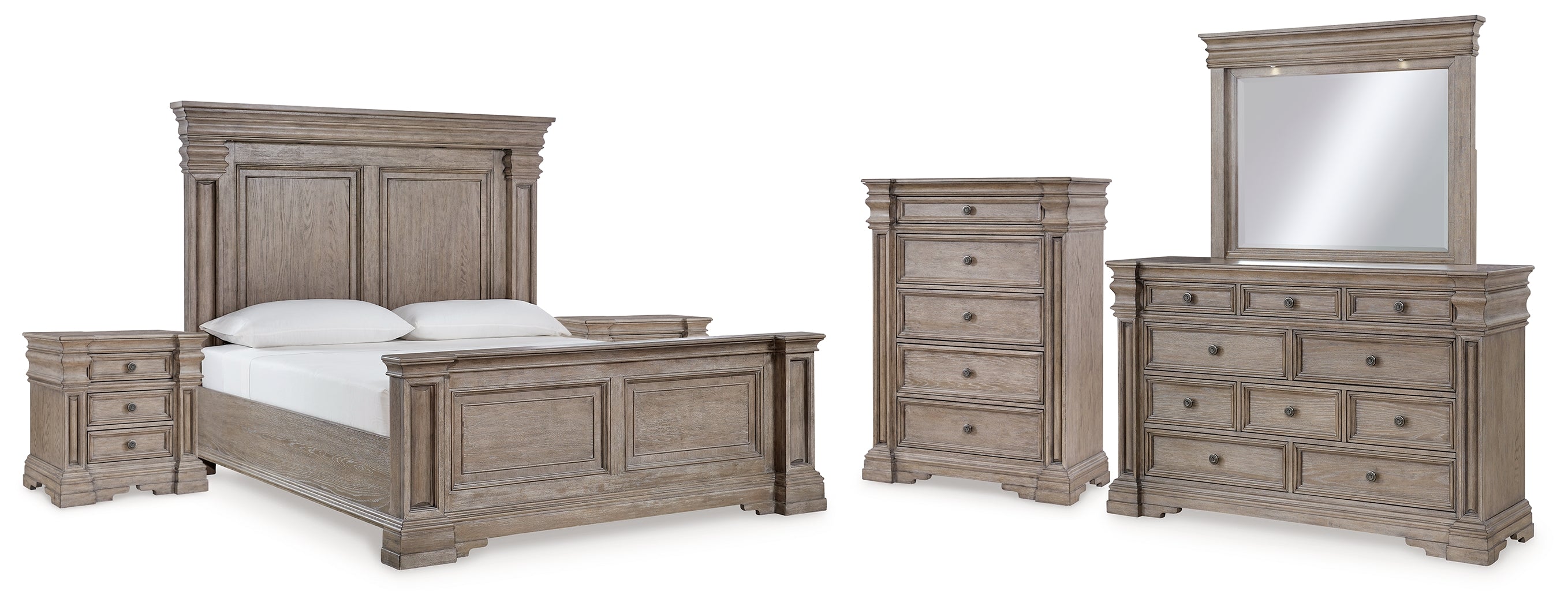 Blairhurst Queen Panel Bed with Mirrored Dresser, Chest and 2 Nightstands in Light Grayish Brown