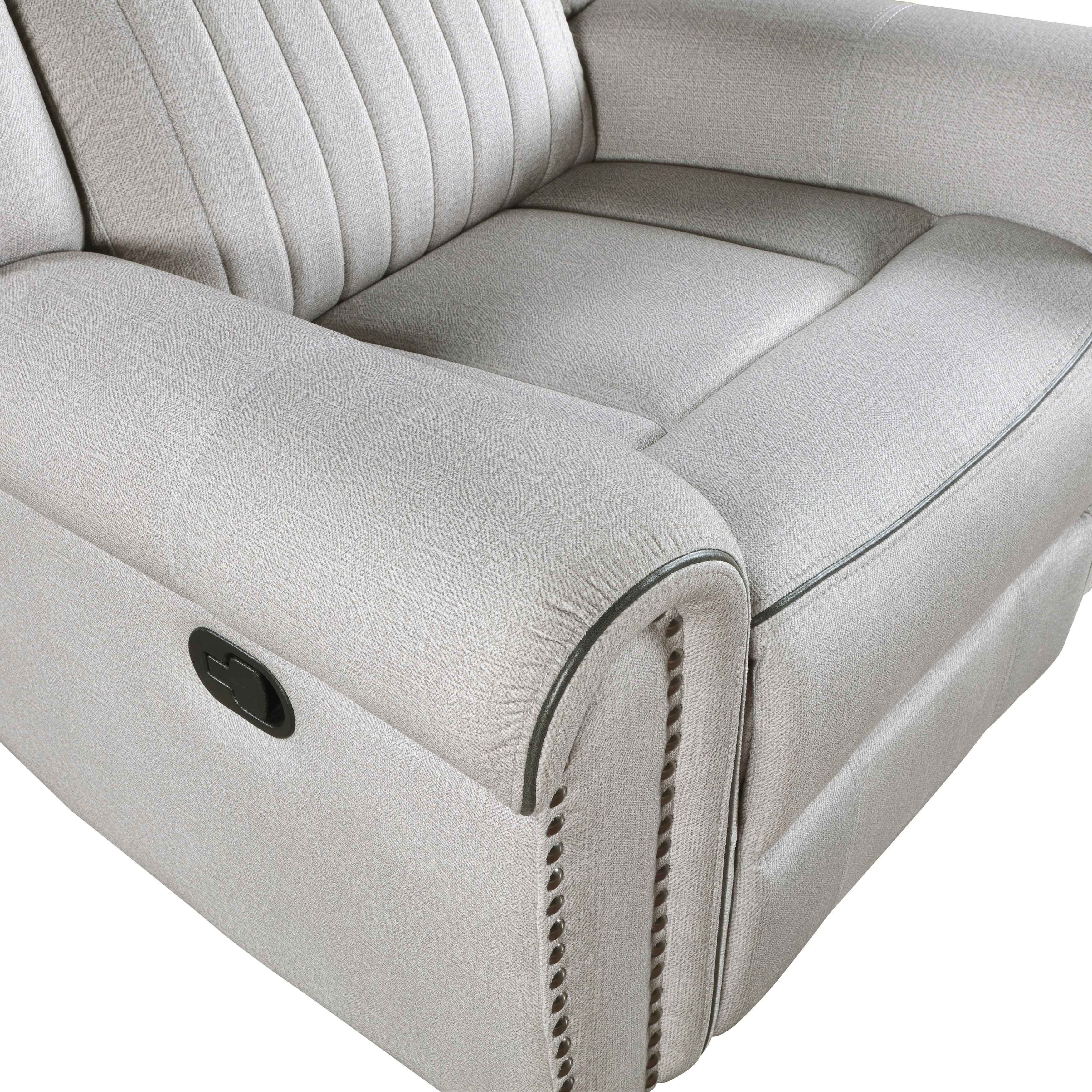 Styled for the transitional home, the Brennen Collection’s comfortable presence will be a perfect match for your casual living room. The sofa, love seat, and chair of the collection feature manual reclining mechanisms allowing for ease of motion when going from seated to reclined. Additional functionality comes in the form of the console’s love seat, its lift-top hidden compartment and cupholders providing a convenient spot for beverage and accessory storage. Plush contoured seating is defined by the contoured stitching, while the arms of the collection are accented with nail head trim. Mist-hued textured microfiber covers the seating group, providing soft touch and decorative versatility.
