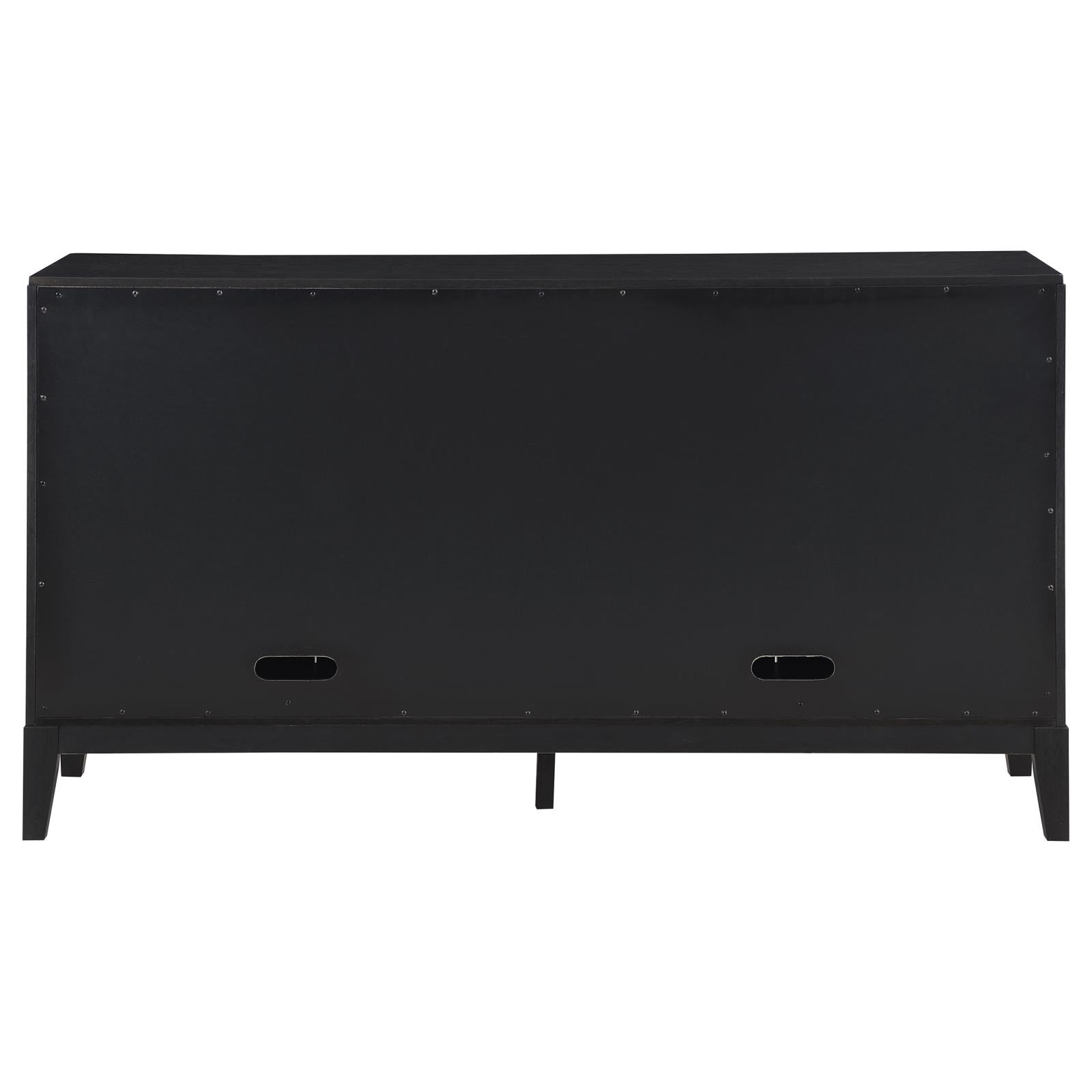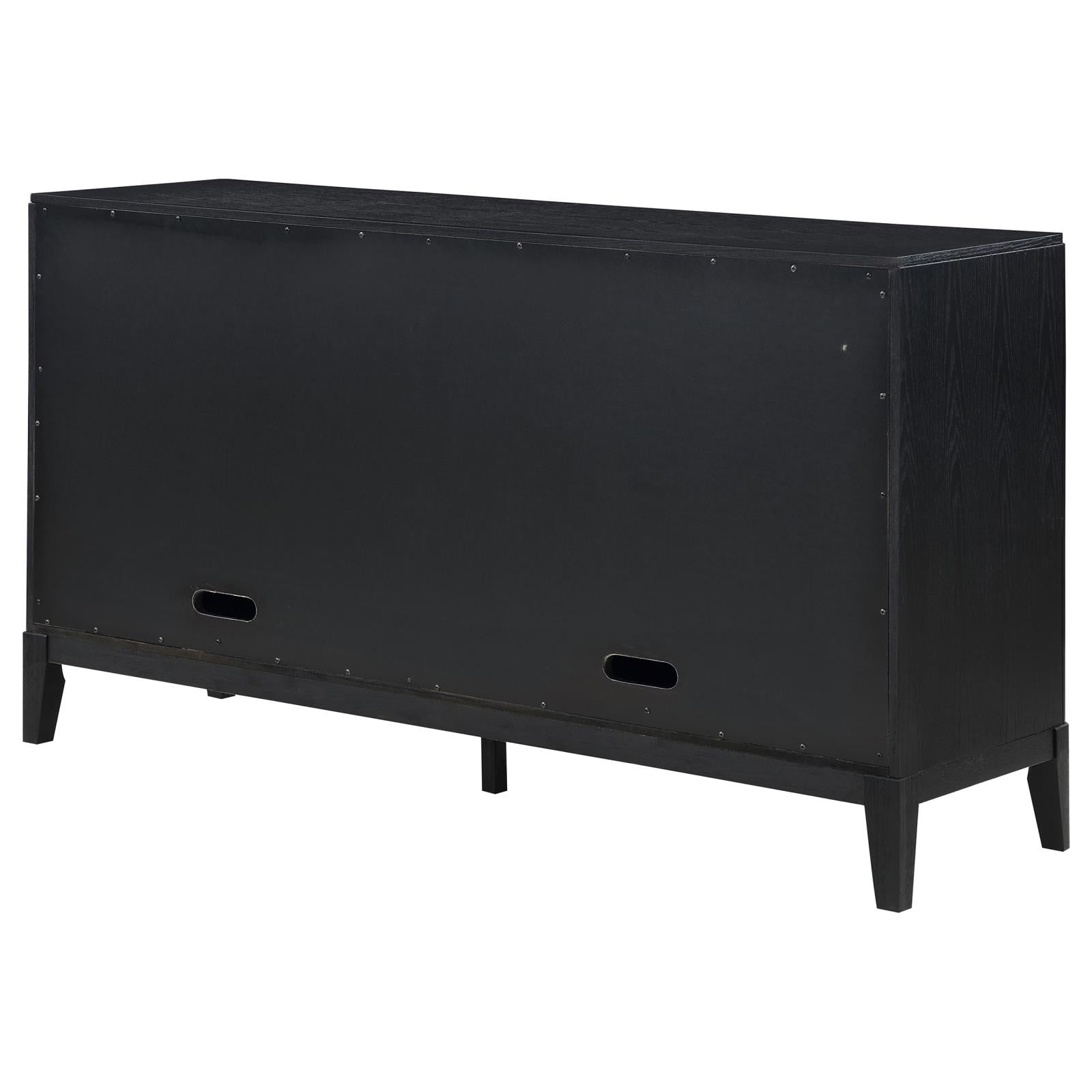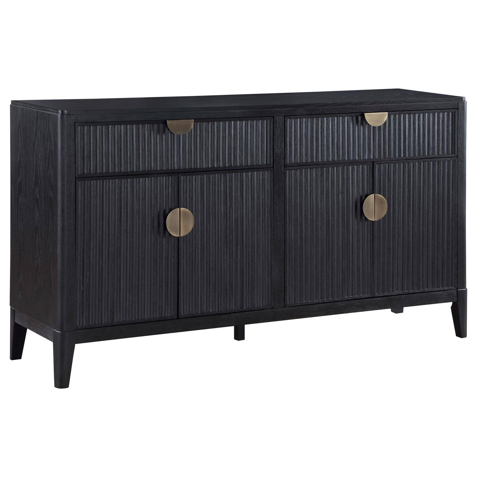 Captivating with a touch of Art Deco style, this black wood sideboard is a functional and fashionable addition to your dining room or living space. A great choice for expanding dining room storage, this chic sideboard is built of Asian hardwoods and wood products, sturdy and solid. A dramatic black finish embellishes linear groove designs on its door fronts and drawer fronts, adding a textural element to impart dimensionality. Find space for your serve ware and implements in a pair of top drawers and in shelving behind four doors. Drawers feature English dovetail construction on metal extension glides, and ornate metal hardware completes an artisanal look.
