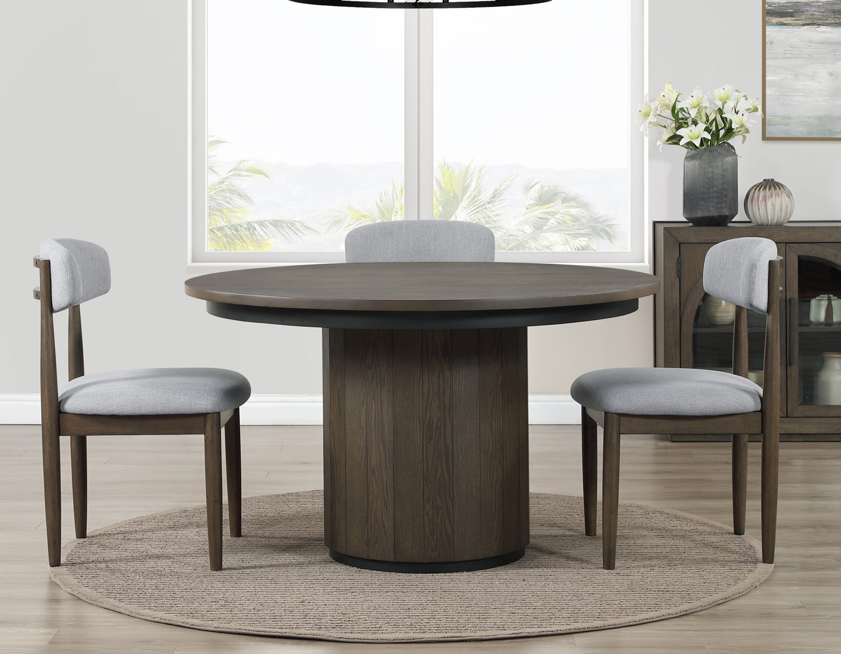 Sophistication meets modern comfort in the Burlington 5-piece 52-inch Round Dining Set. The table boasts a lustrous cocoa finish with muted black accents, complemented by solid wood side chairs featuring tapered tubular legs. The chairs’ durable polyester upholstery ensures easy maintenance, keeping your dining space stylish for years. This set seamlessly blends upscale elegance with casual comfort, creating a versatile dining experience. Whether for formal dinners or relaxed meals, the Burlington set enhances any setting with its perfect balance of chic design and relaxed living, making it an essential addition to your home.