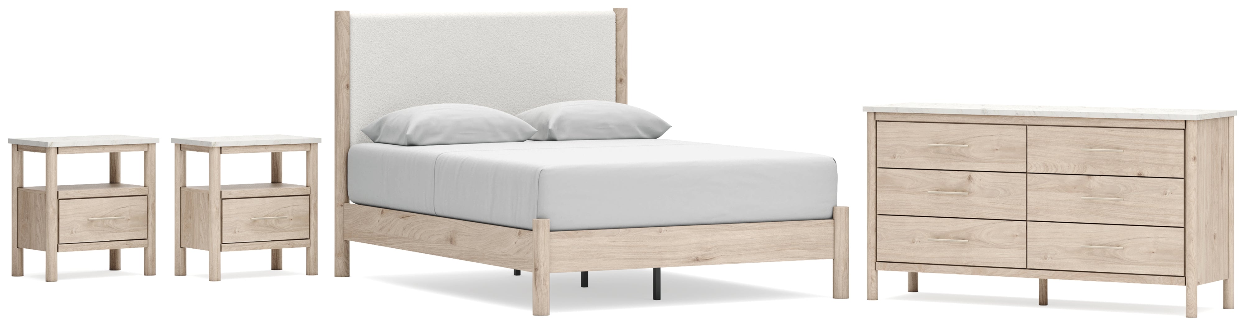 Cadmori Queen Upholstered Panel Bed with Dresser and 2 Nightstands in Two-tone