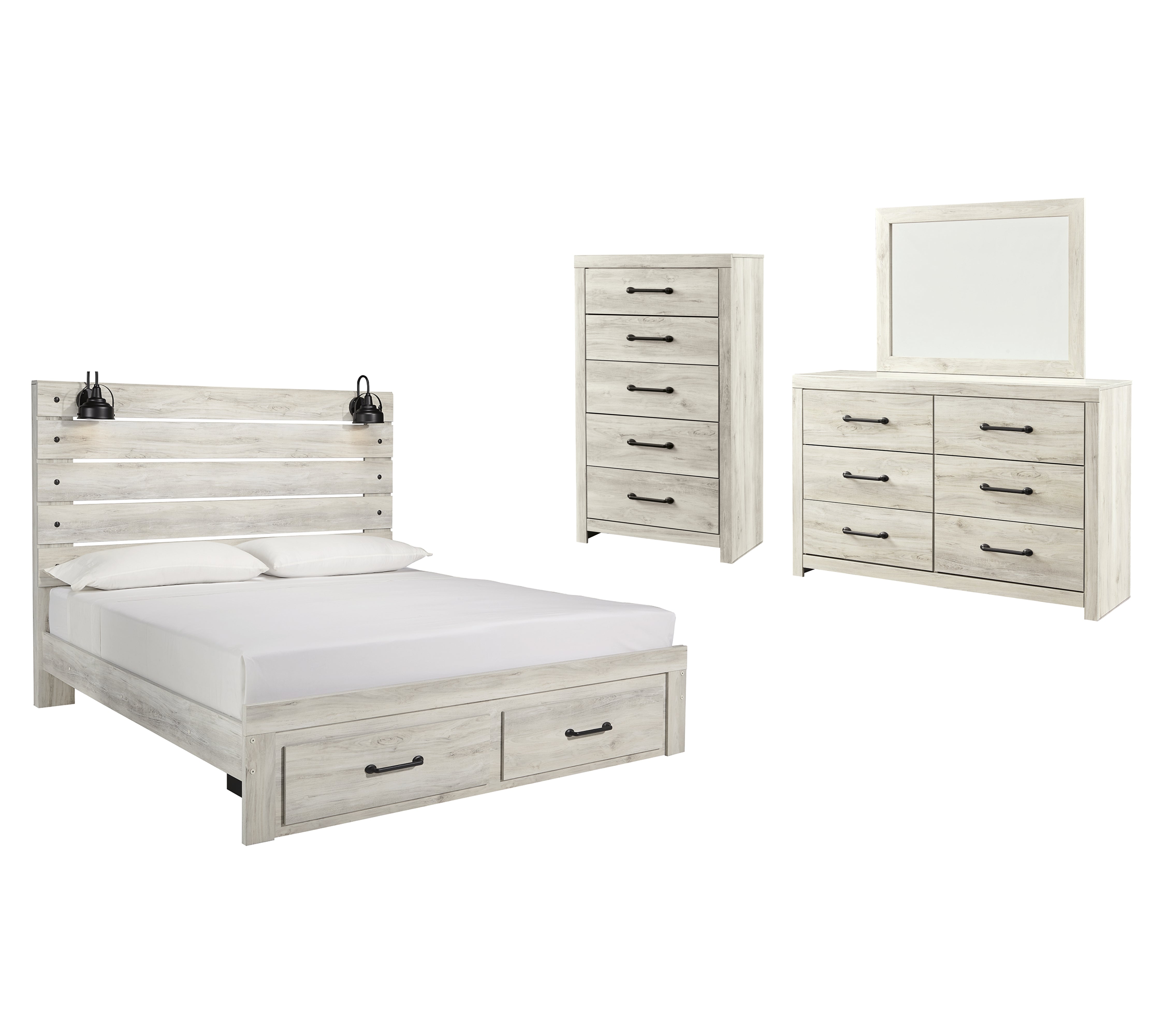 Cambeck King Panel Bed with 2 Storage Drawers with Mirrored Dresser and Chest in Whitewash