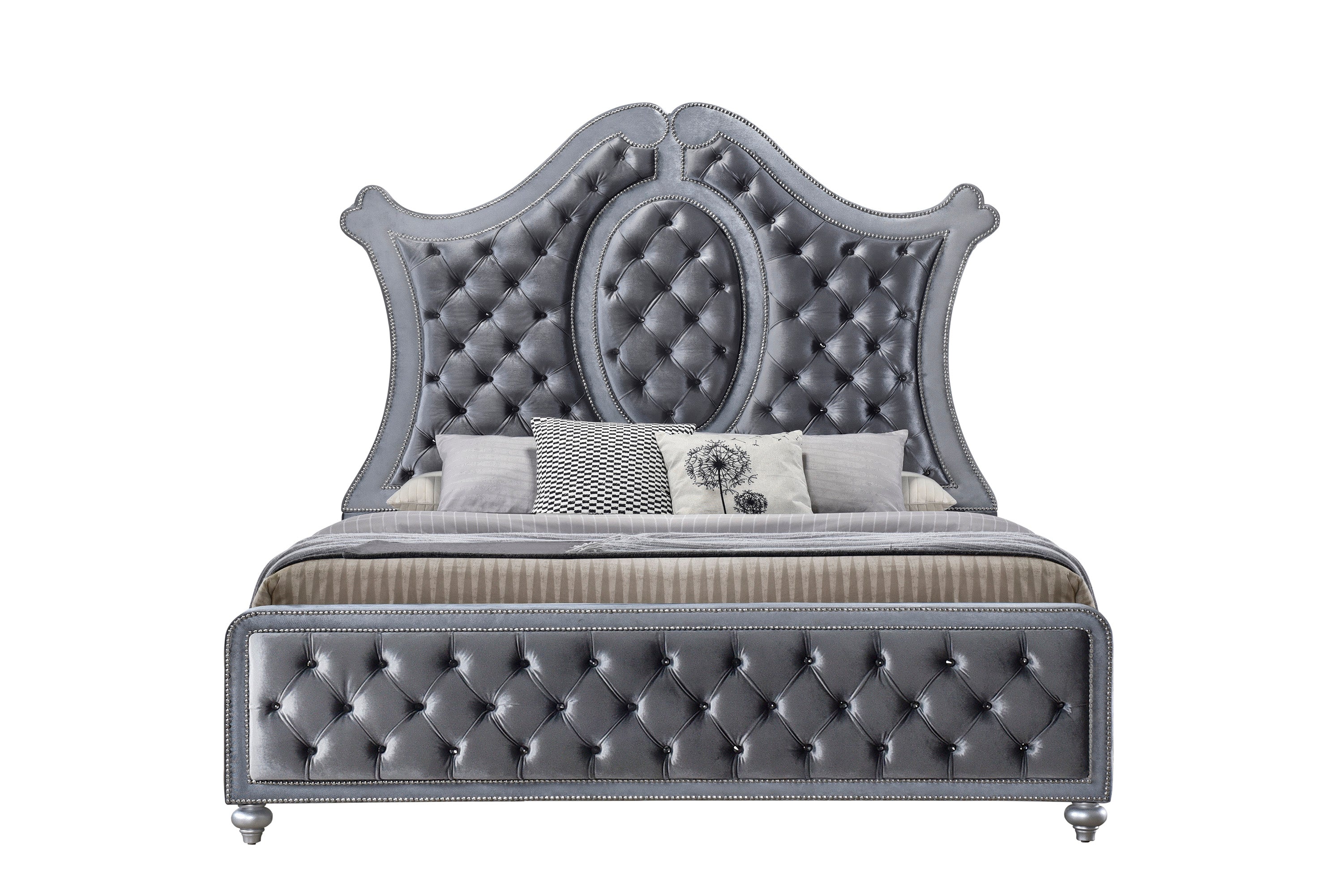Bold and graceful, the Cameo Gray Queen Upholstered Panel Bed blends timeless elegance with a touch of modern edge. Featuring an ornate, sculpted headboard with deep button tufting and a luxurious gray velvet finish, this bed radiates upscale glam. Decorative nailhead trim outlines the silhouette, while the crystal-accented details offer dazzling sophistication. Luna Furniture introduces the Cameo Gray Queen Upholstered Panel Bed to enhance the beauty of your living spaces.
