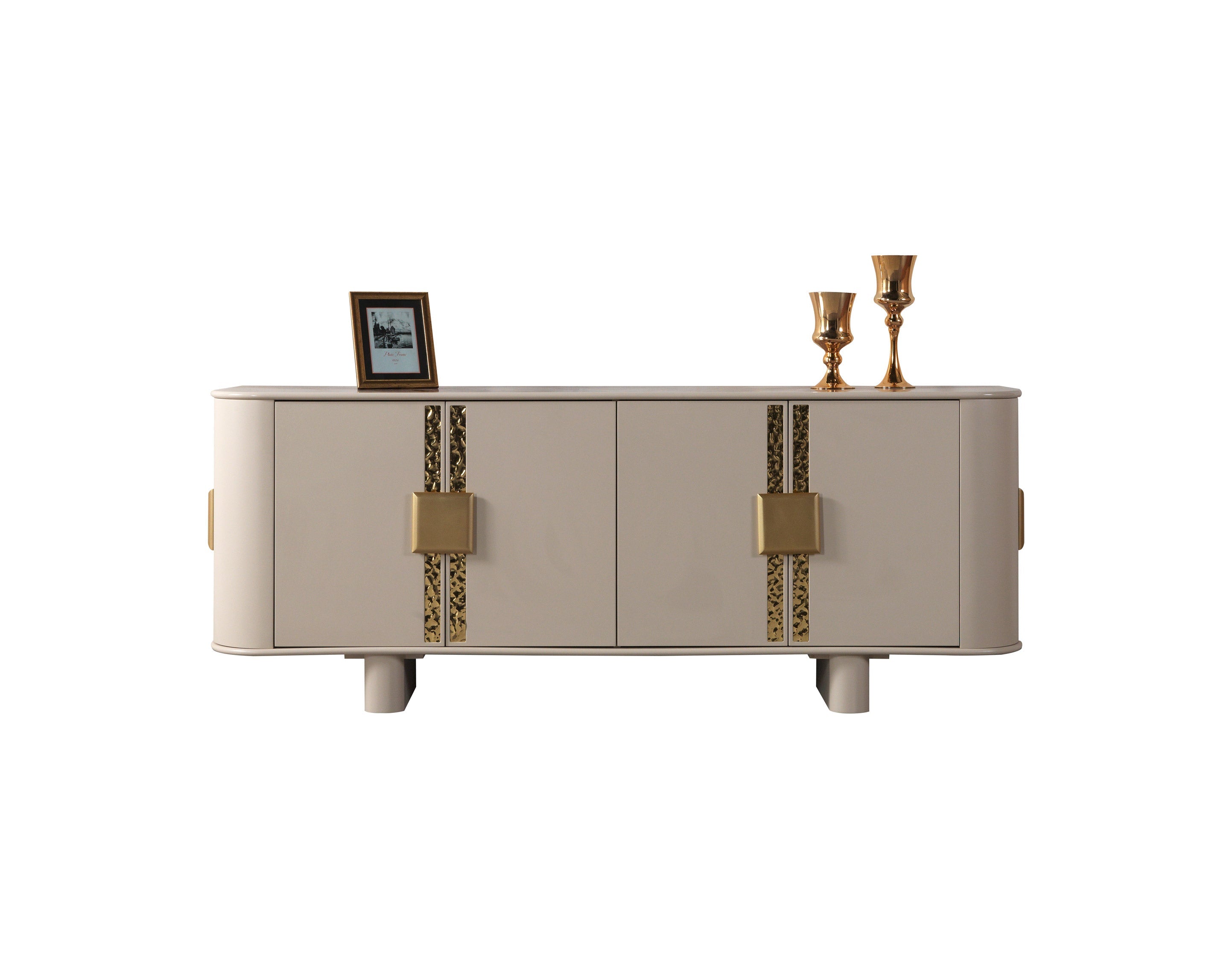 The Carlina Ivory Dining Server is more than just a storage piece; it is a symbol of elite craftsmanship and modern design. Its combination of grand scale, shimmering finishes, and bold geometric hardware ensures it remains a timeless addition to your home. Elevate your dining area with a piece that promises both unparalleled style and practical luxury.
