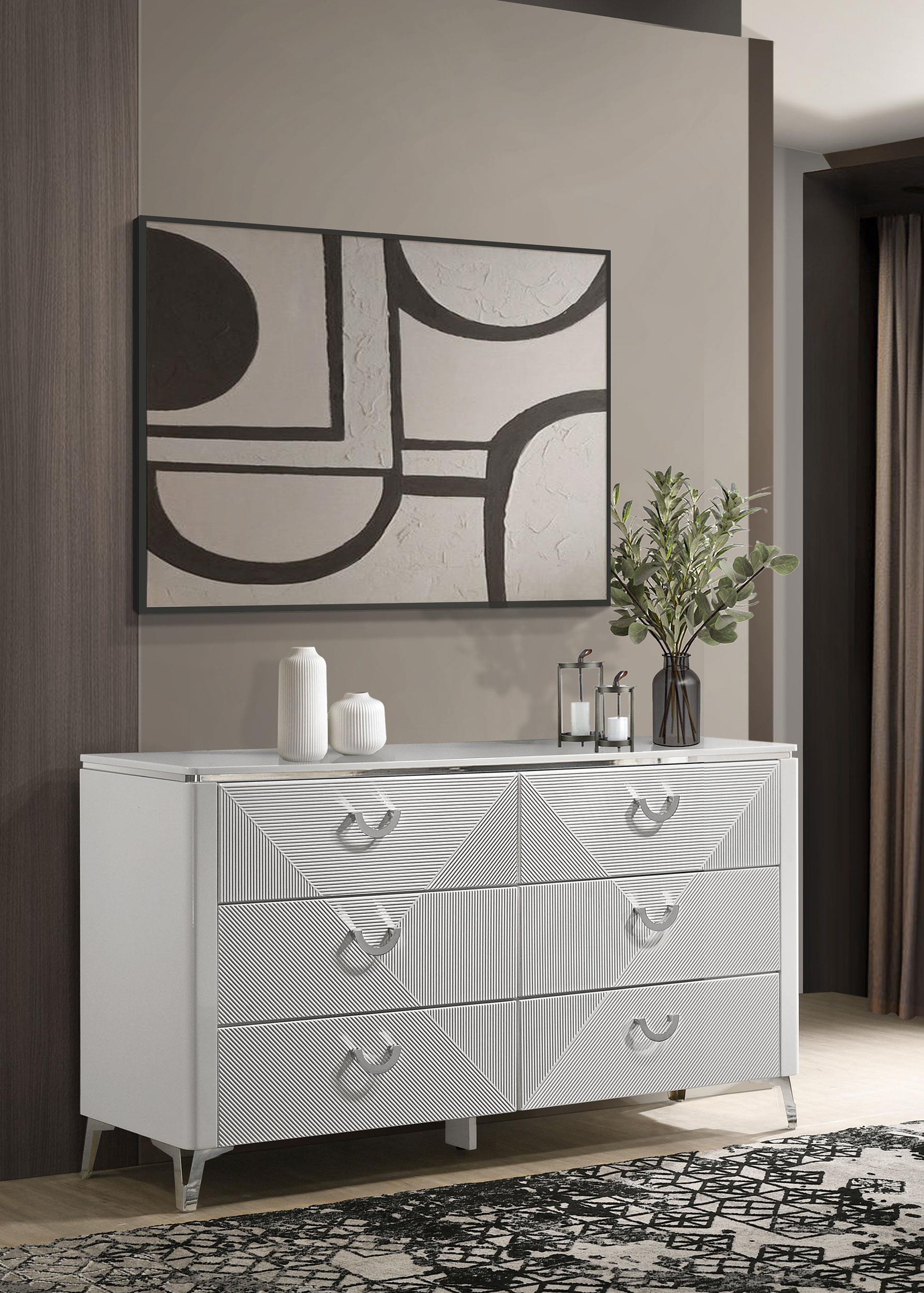 Sleek and sculptural, this six-drawer dresser pairs crisp white high gloss with dimensional detail for a bold modern look. Its geometric drawer fronts feature ribbed textures forming inverted V patterns, highlighted by polished chrome U-shaped pulls. Felt-lined top drawers add a refined interior touch, while smooth-gliding drawers operate on 45mm ball bearing hardware. Finished with slender legs and clean lines, this dresser brings texture and brightness to contemporary bedrooms.