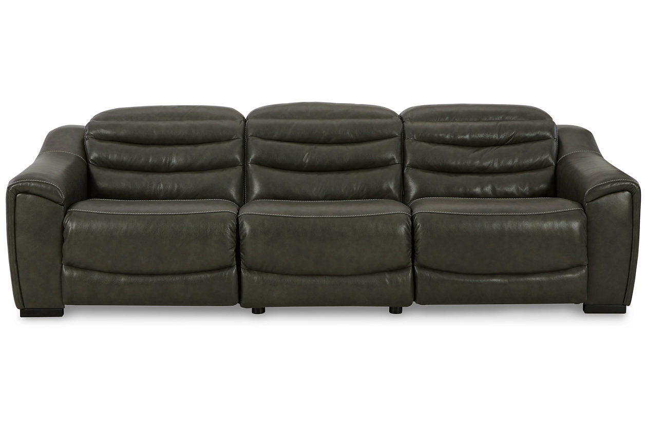 For those seeking to curate a living room retreat that offers superior comfort and a contemporary aesthetic, this sleekly designed power reclining sectional will become your favorite source of at-home serenity. Rest on real leather in the spacious seating area and use the one-touch power control to recline and adjust the headrests with ease. As you recharge after a long day, your devices can too with USB charging. This sectional is visually enticing in a luxe dark gray, with slope track arms and stitched detailing on the back to enhance its modern appeal.