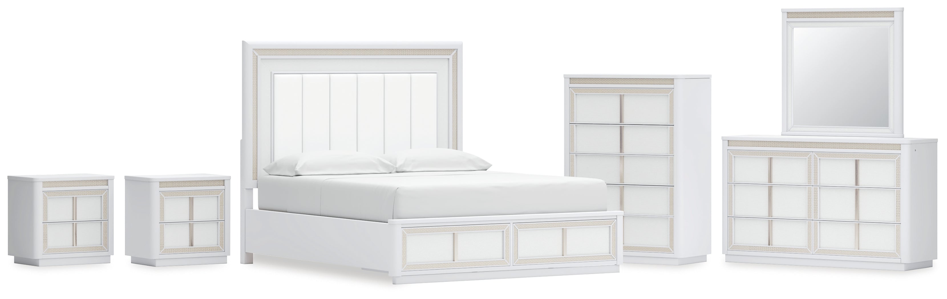Chalanna California King Upholstered Storage Bed with Mirrored Dresser, Chest and 2 Nightstands in White